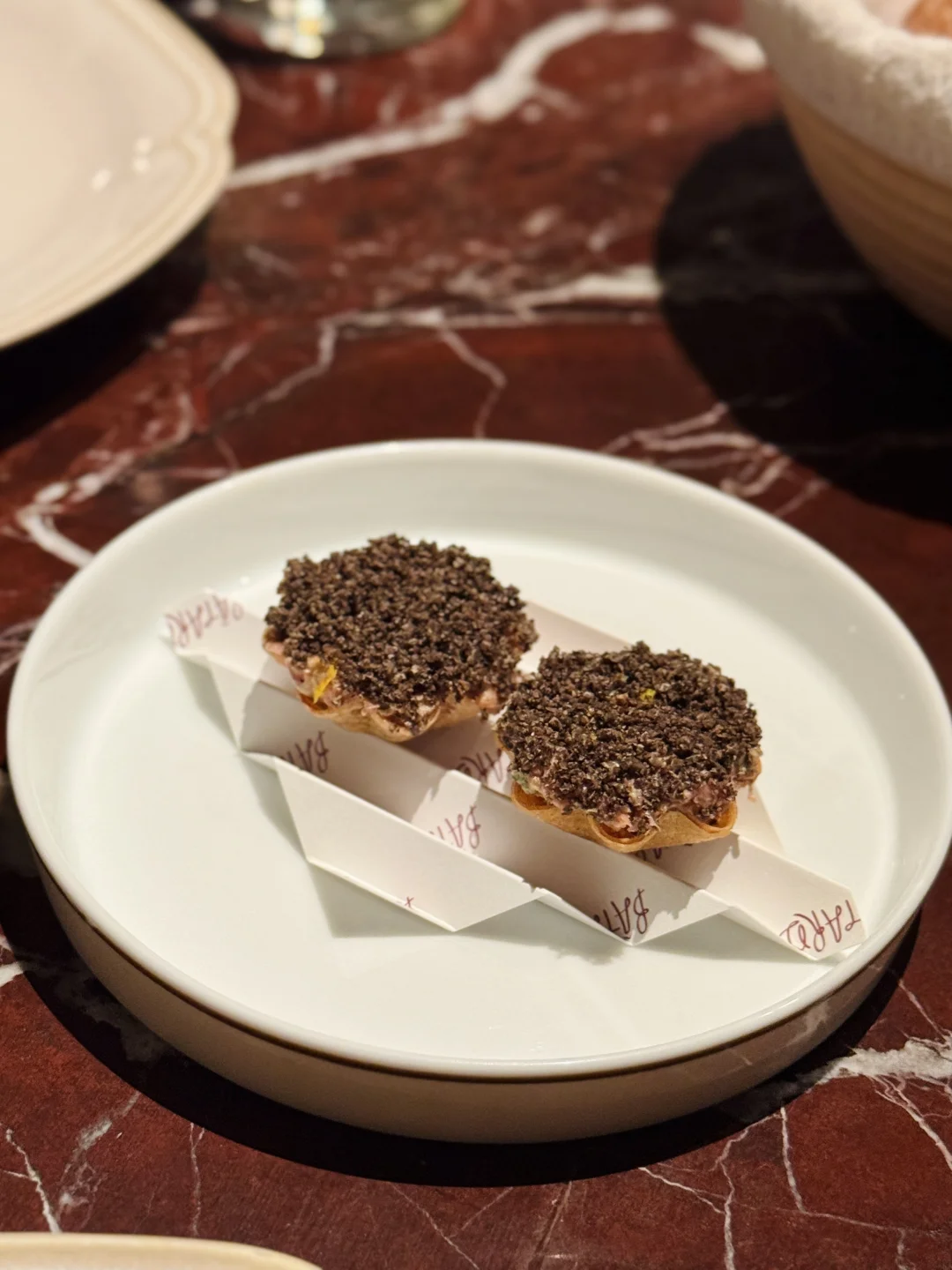 前菜的🐂beef tartre做成小挞的样子好可爱!表层铺满黑松露碎,挖开是鲜嫩的牛肉泥,超满足