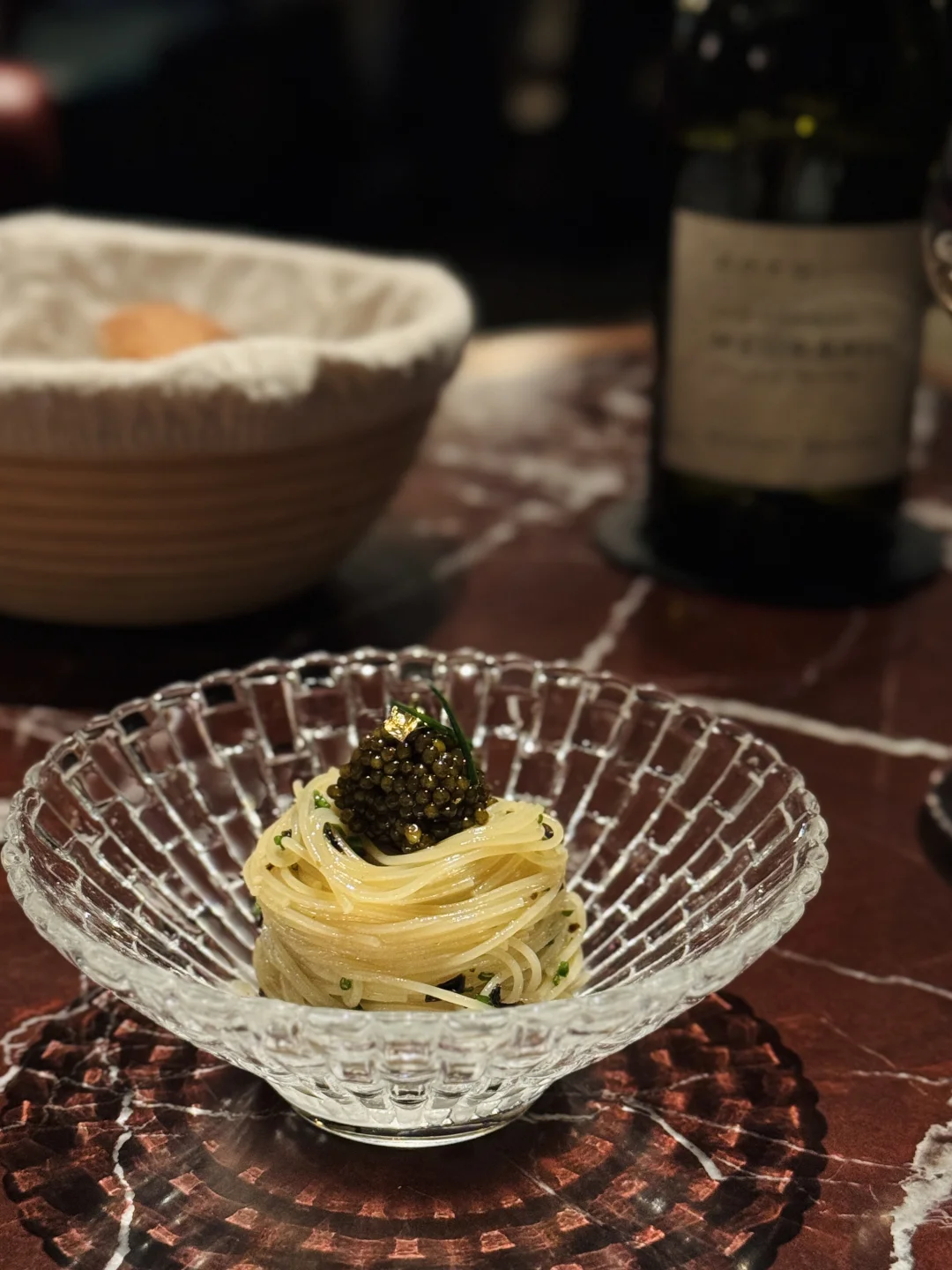 👼cold angel hair果然是招牌!水晶玻璃碗装着细如发丝的意面,顶部堆着鱼子酱和黑松露,入口冰凉丝滑