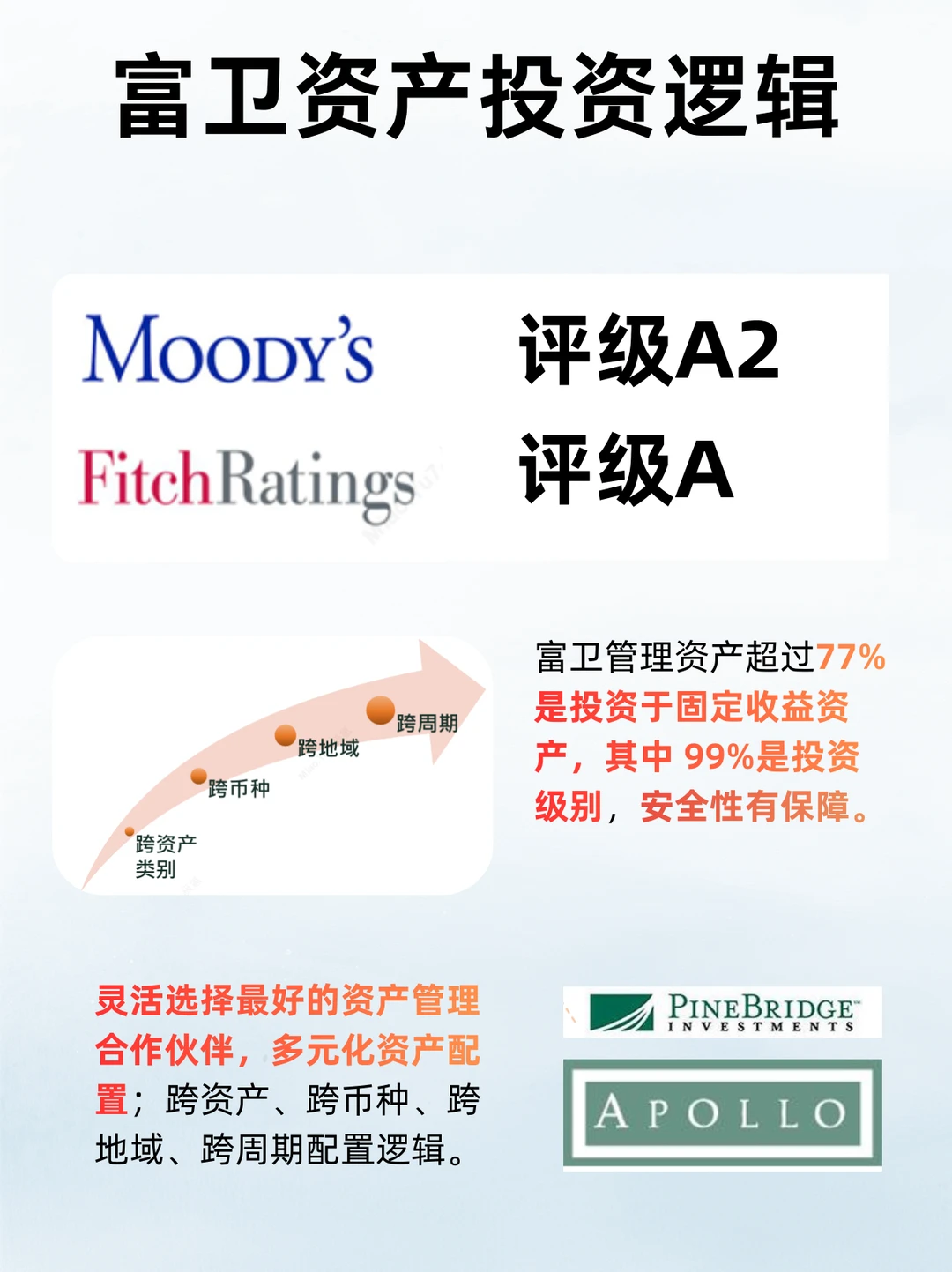 另一个重要的指标是分红实现率,比率越高则兑现能力越强,历年的分红实现率越稳定越好。富卫的王牌储蓄保险产品连续多年平均分红实现率超过100%,意味着实际分红比演示分红更高,表现超预期。此外,富卫的投资经理在分享中还提到,他们是和柏瑞投资、阿波罗等顶尖资管合作,全球资产配置分散风险,超过77%投资于固定收益资产,其中 99%是投资级别,风险控制做的是很好的,对于我们个人也很有借鉴意义。