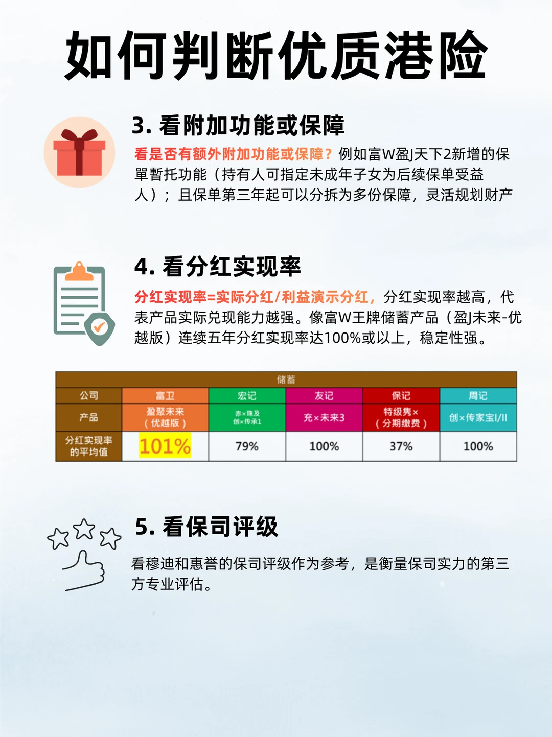 总结一下,筛选港险的逻辑:先看保司评级和股东背景、再看产品需求匹配度和预期IRR、然后看分红实现率和底层资产配置逻辑,基本心里就有数了。