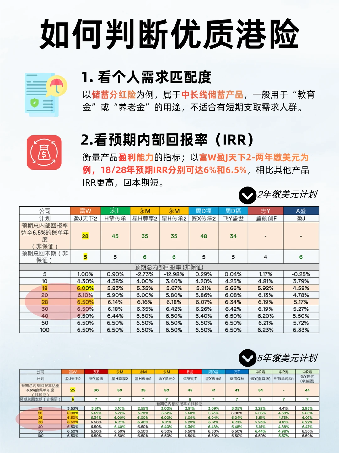 然后要看产品需求匹配度和预期IRR,以储蓄分红险为例,一般用于“教育金”或“养老金”,持有越久越划算,短期支取就不太合适。同等情况下产品的预期内部收益回报率(IRR)越高越好,以近期热议的富W盈J天下2-两年缴美元为例,18年IRR达到6%(非保证),28年IRR达到6.5%(非保证),成为最快达阵的产品之一,看来港险圈也是越来越卷了。