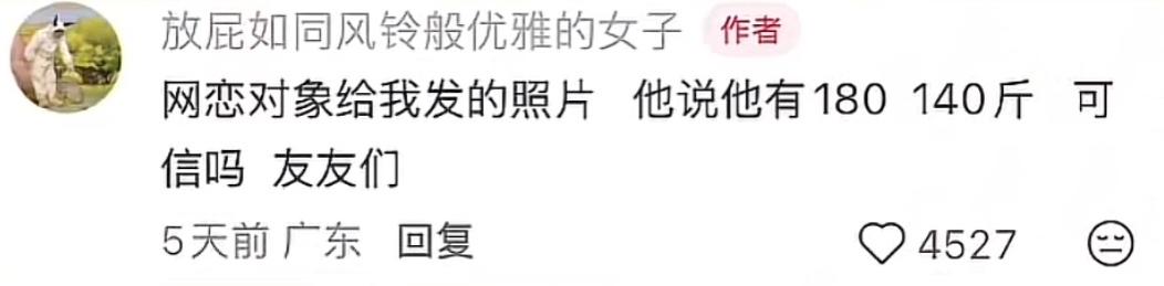 但凡脸和身高有一个能看的,谁会只发手?有女生在网上求助,称其从未见过面的网恋男友自称身高180、体重140斤,只给她发了一张手的照片,让网友帮忙分析是否真实。 评论区网友化身福尔摩斯,从这张手照入手展开分析。首先,手掌肥厚无骨节,肉窝遍布,手腕走向不对,多出来一坨肉,说明身体脂肪含量非常高,初步断定是个胖子。通过手指长度判断,其身高大概率没有180,就算有也是超级短腿,应该在170上下浮动两厘米。 再看手指第一指节,有明显被熏黄的痕迹,说明经常抽烟。同时,能看出体毛旺盛,很有可能是雄激素分泌过剩,秃头的概率很大。 网友总结,这是个抽烟喝酒、熬夜打游戏,且体毛旺盛但有点秃顶的矮胖子。他连这样的手都敢发出来,说明手已经算是他身上能看的部位了,其他地方就不用多说了。