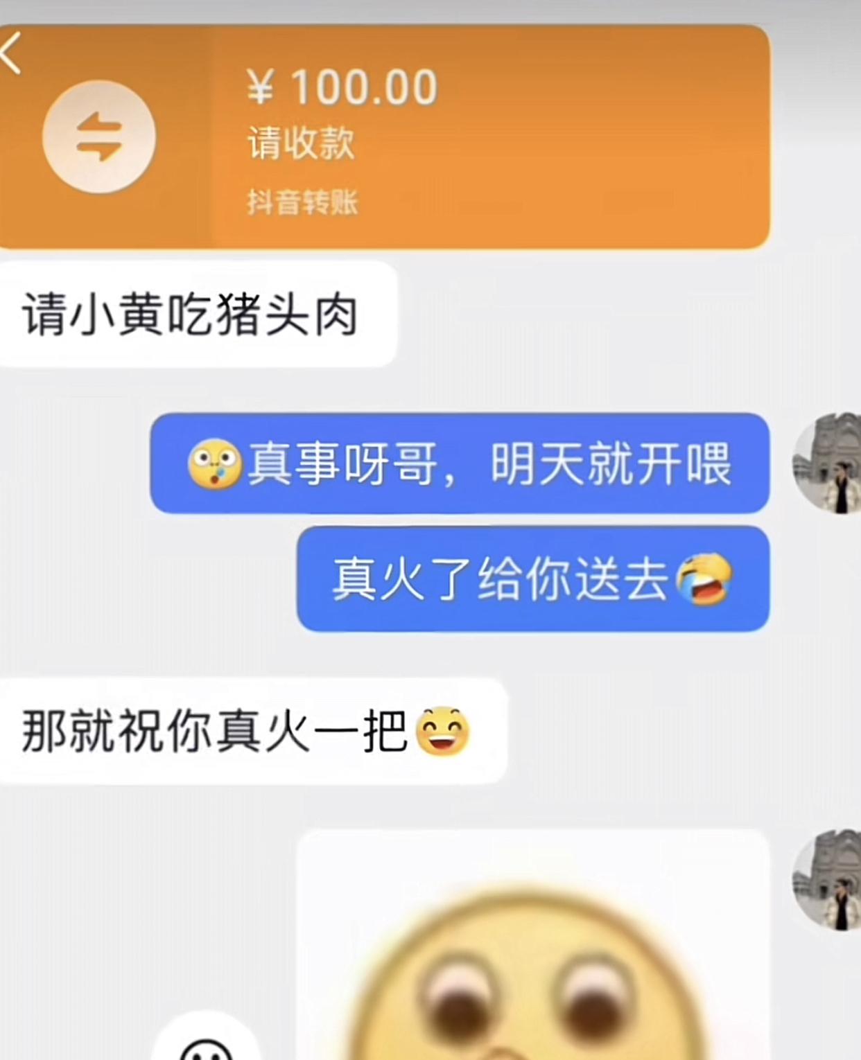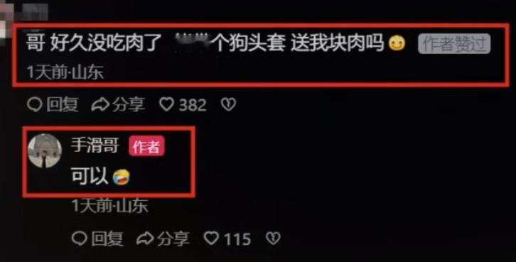 见过狗来讨吃的,没见过人扮狗来讨吃的。 起因是一博主在街头拍视频卖卤肉,起初生意很冷清,没几个客人来光顾,反倒引来一只大黄前来。博主看着大黄可怜,心软之下就开始了投喂。之后有一位大哥刷到视频后让博主直接喂一整块卤肉,说这样流量不得起飞,并表示自己可以转100个博主,就当是他请大黄吃卤肉。 于是两人一拍即合,网友当即给博主转了100元钱,博主第二天真就给大黄扔了一大块卤肉,这一扔不仅把路过的大姨看呆了,还把车上目睹一切的泰迪急得快说人话了。而博主的视频也因此火了,点赞上百万。 尝到甜头的博主,之后大黄每次一来,她就毫不犹豫的扔两斤卤肉。甚至如果大黄哪天没来,博主还会特意在下班后还把卤肉带上,骑上车前往大黄的基地,集体投喂。 看到视频的网友们却因此破了防,下班想买半斤猪头肉没舍得,刷个视频发现狗吃上了。于是有人彻底坐不住了,评论说哥我好久没吃肉了,带个狗头套能给我一块吗? 本以为是句玩笑话,博主就回复了一句可以,没想到网友第二天真就带着头套来了,博主当时都懵了,不过还是把卤肉递了过去。 果然是勇敢的人先享受世界,老板你先别走,我这就坐火车过来。