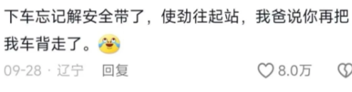 下车忘记解安全带了,使劲往起站,我爸说你再把我车背走了。
