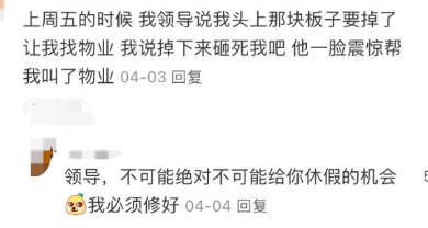 上周五的时候, 我领导说我头上那块板子要掉了让我找物业,我说掉下来砸死我吧, 他一脸震惊帮我叫了物业