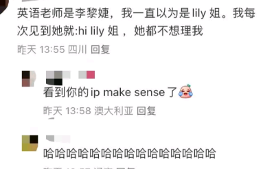 英语老师是李黎婕,我一直以为是lily姐。我每次见到她就:hi lily姐,她都不想理我