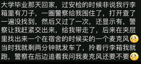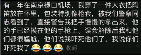 有一年在南京禄口机场,我穿了一件大衣把陶笛放在怀里,被我们警察同志看到了,直接警告我把手慢慢的拿出来,误会解除后我和他们都很尴尬,他们说我吓死他们了,我说你们吓死我了