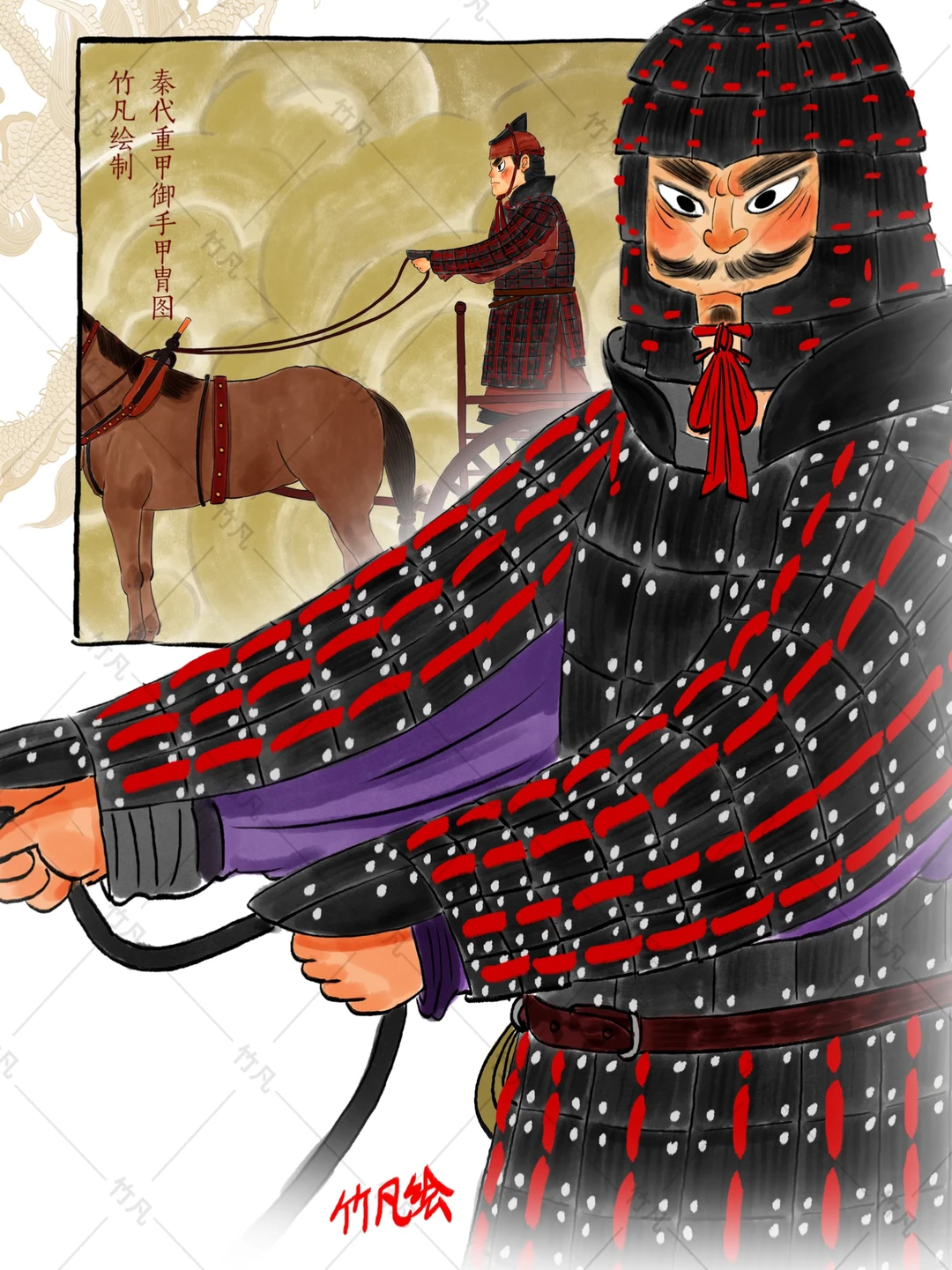 绘制内容为兵马俑御手俑甲胄样式,但是实物并未戴胄,应该是等待秦始皇检阅不得戴盔(个人猜测战场还是正常戴全盔才比较符合逻辑),所以此次绘制增加了盔完整的护甲体系,御手俑的护甲最有特色的地方是手臂护甲,全臂防护完备,最大限度提高士兵的生存率和防御等级。