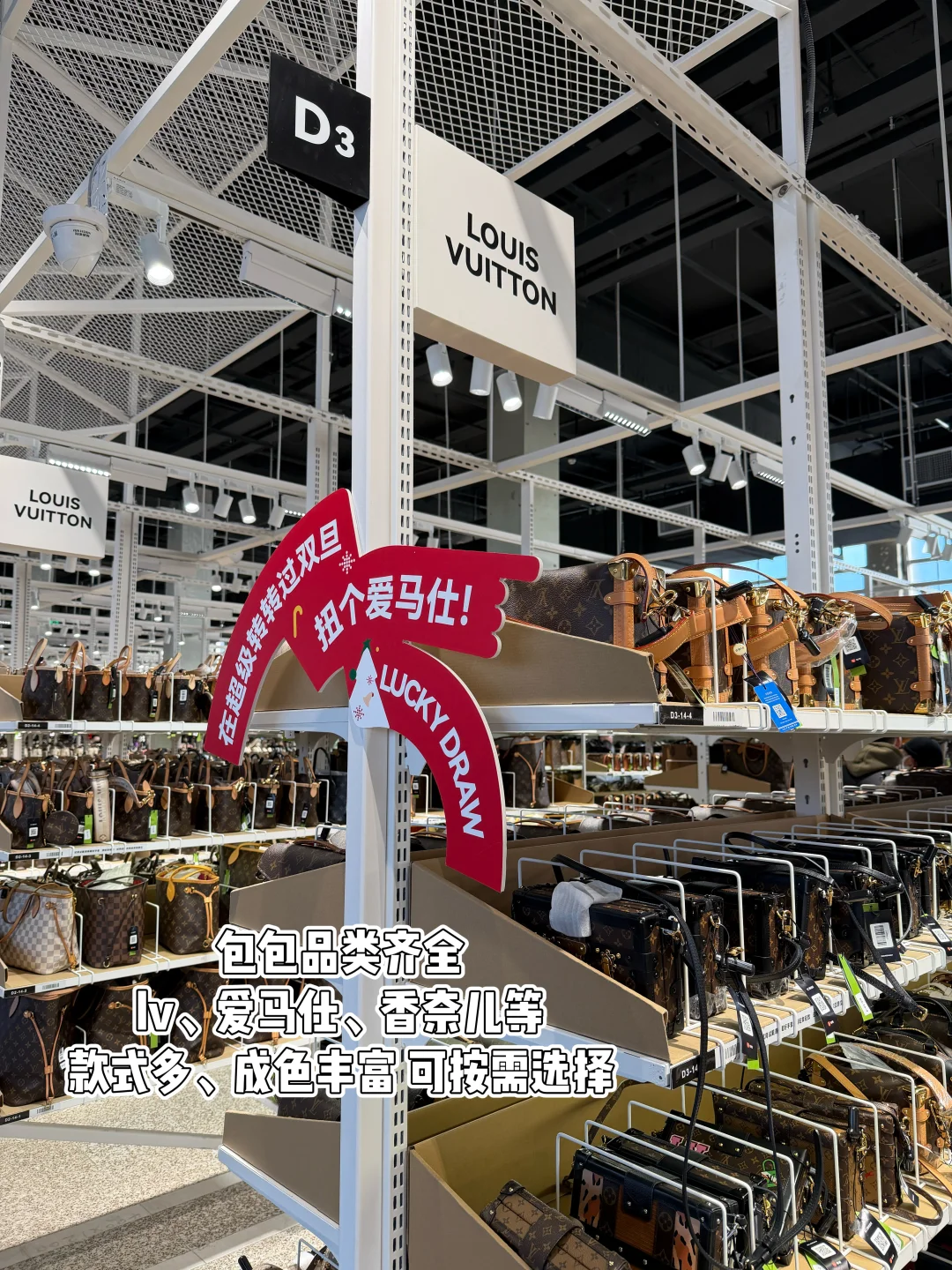 3000+平的大店,面积大、好逛👍包包品牌齐全,款式丰富,可按需选择,品类多,除了包包还有相机、数码、鞋服、饰品、吹风机,还有男生爱的游戏卡带区,陪逛不无聊😜自助式购物,随意试背扫码查价,i人自在,最近还有元旦活动,居然把爱🐎仕塞进了扭🥚机里,快来扭出你的新年🎁
