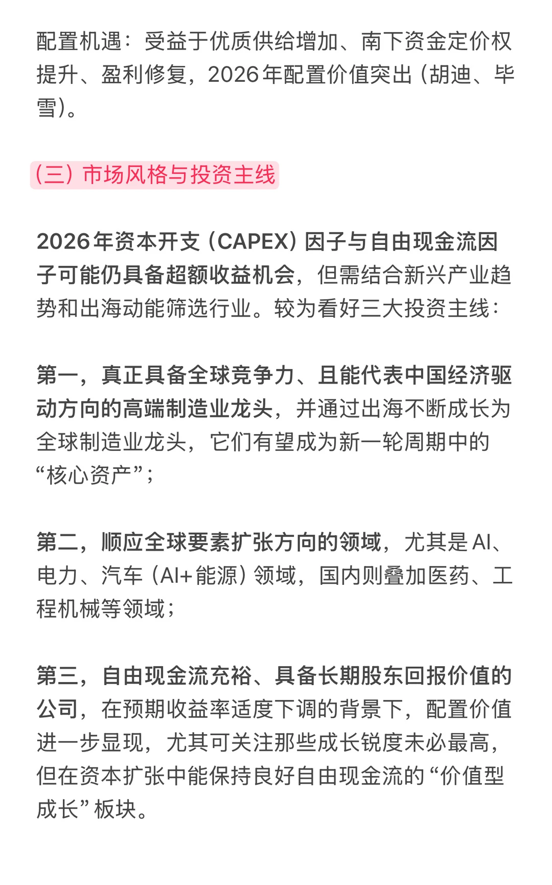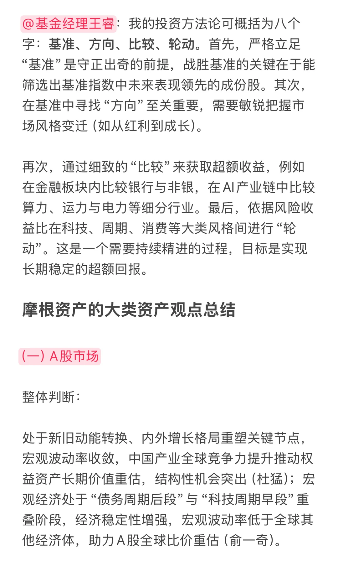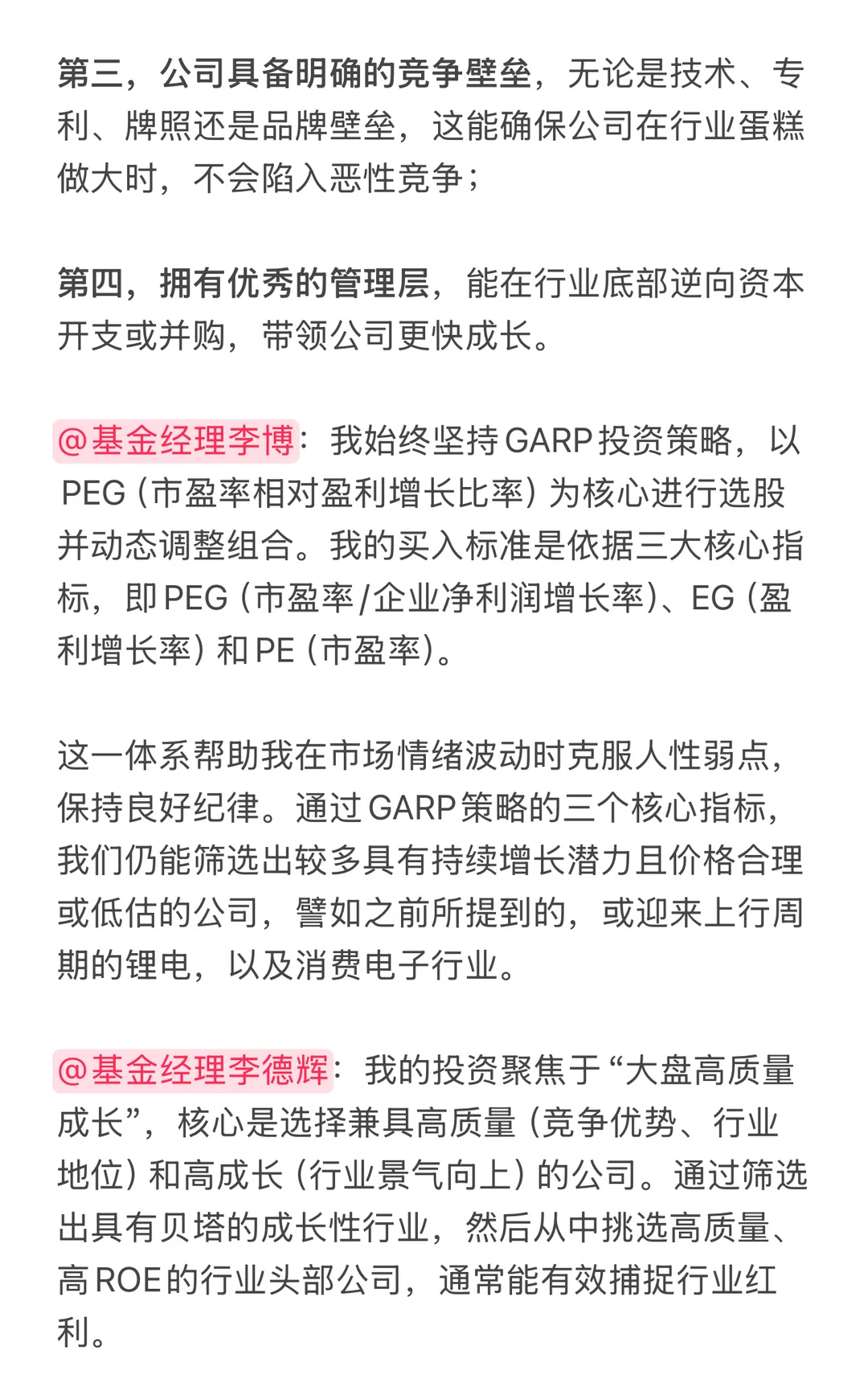 看了摩根资管的分析,挺有参考意义的。值得参考的不只是大类资产观点,还有各个基金经理的投资策略阐述,市场一直在变化,大家有时过于追热点了,策略的价值往往被忽略。 我是感觉GARP(growth at a reasonable price)的策略挺适合普通人的,我也比较常用,怎么判断赛道里的优质标的,PEG、ER、PE这几个指标很好找,也不用自己算,直接在第三方平台上都能找到。补充一点他没有提到的,不光要看ER,也要看ROIC-WACC,大于零才是有效的价值创造。