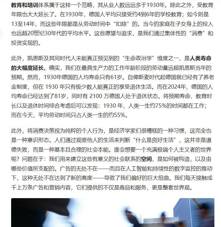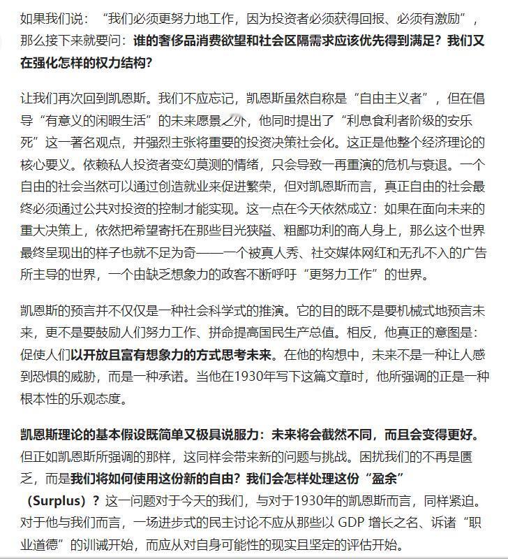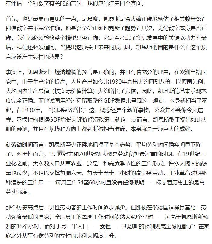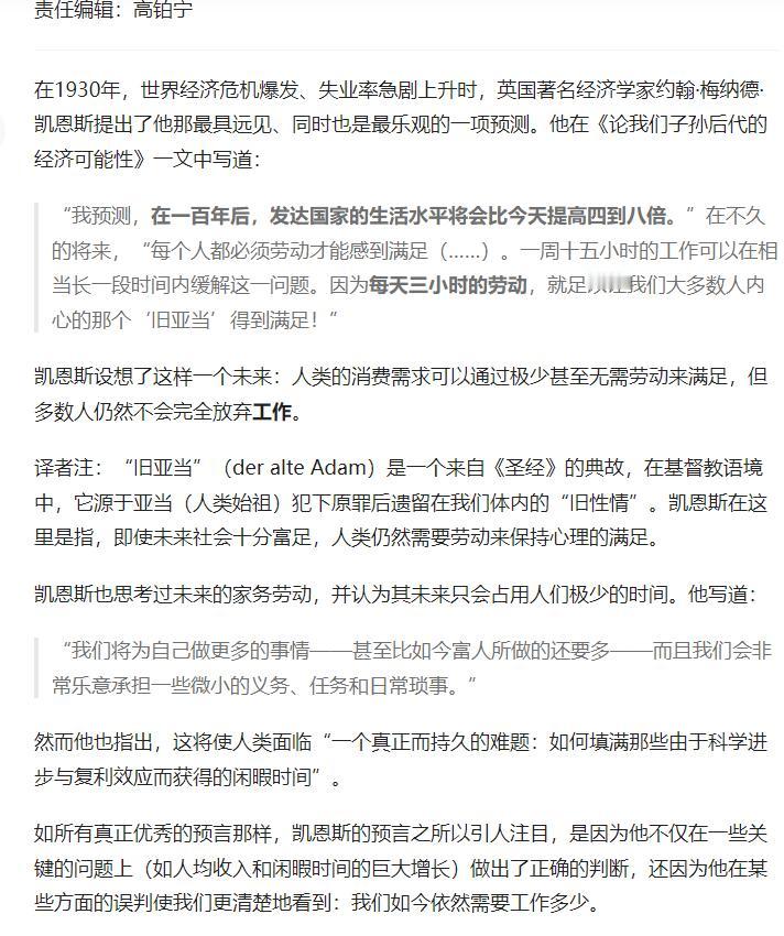 哥伦比亚大学教授亚当・图兹解读凯恩斯 1930 年的百年预言,指出其关于发达国家经济增长的预判准确,但对 15 小时工作周的设想未实现,分析了误判原因并强调未来经济形态由技术、制度和生活理念共同塑造。 原文来自头条创作者图说政经的文章: