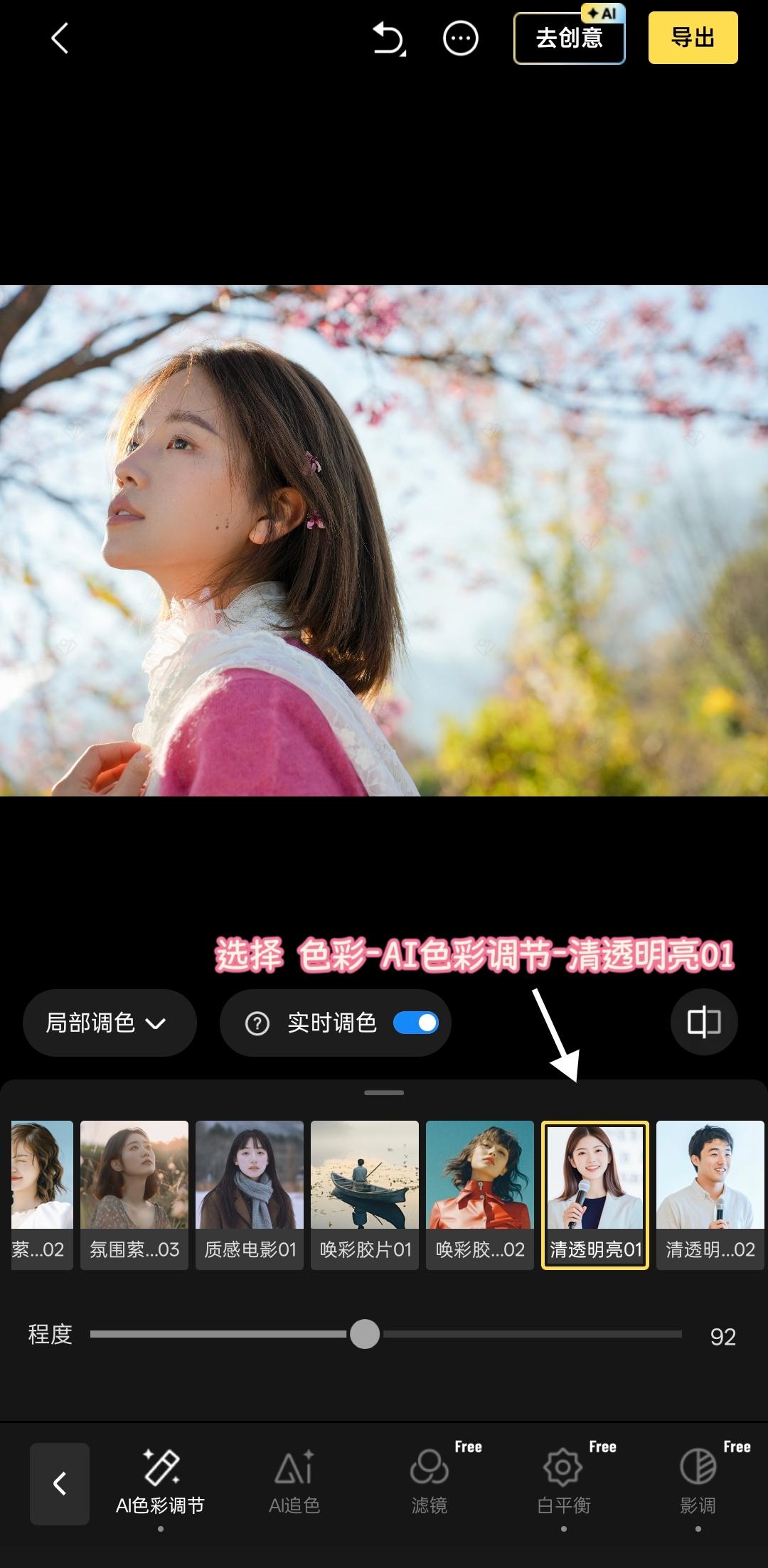 调色分享|三分钟批量调出氛围感组图。打开像素蛋糕,找到“色彩”中的“AI色彩调色”选择“清透明亮01”,最后“AI追色”将其他照片一键批量调色。