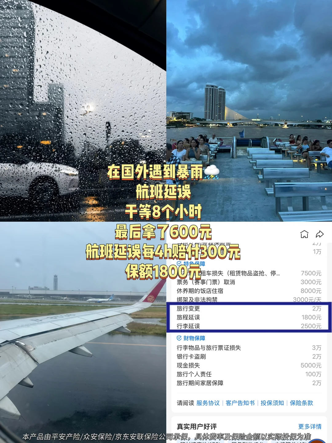 在马来西亚,碰到了当地的雨季,飞机特别容易延误,还好临去机场前,在当地好朋友强烈提醒买了无忧保,居然还真用上,航班延误拿了600块,而且那次我还带了托运行李,也是有赔付的。托运行李延误2500元保额,机票钱都快回本了…瞬间不焦躁了