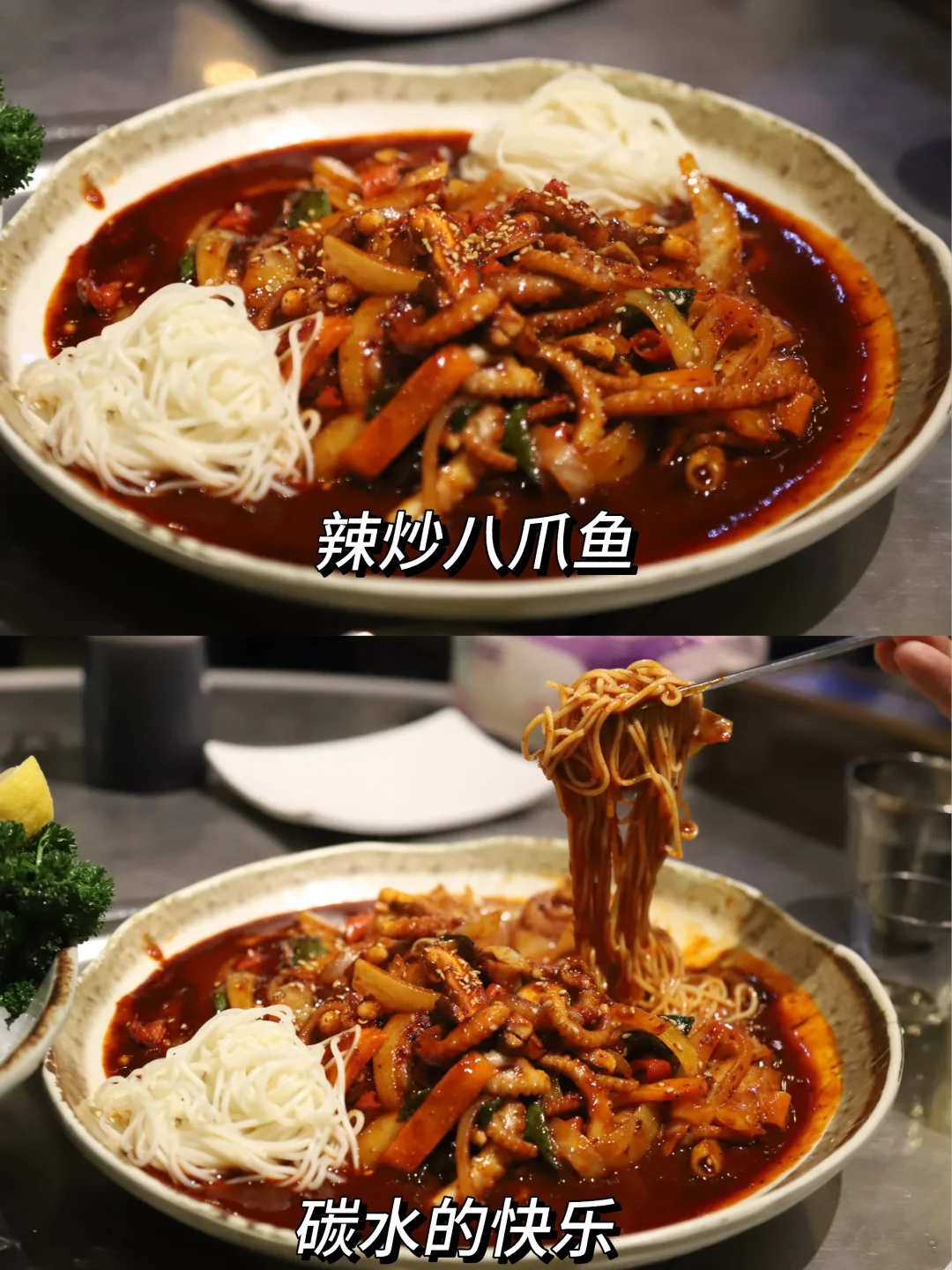剩下我点过的菜:辣炒八爪鱼推荐,分量大,会放一份面碳水的快乐谁懂。生牛肉不好吃,有冰沙感不推荐。烤鱼一般般,韩式的烤鱼太清淡了。