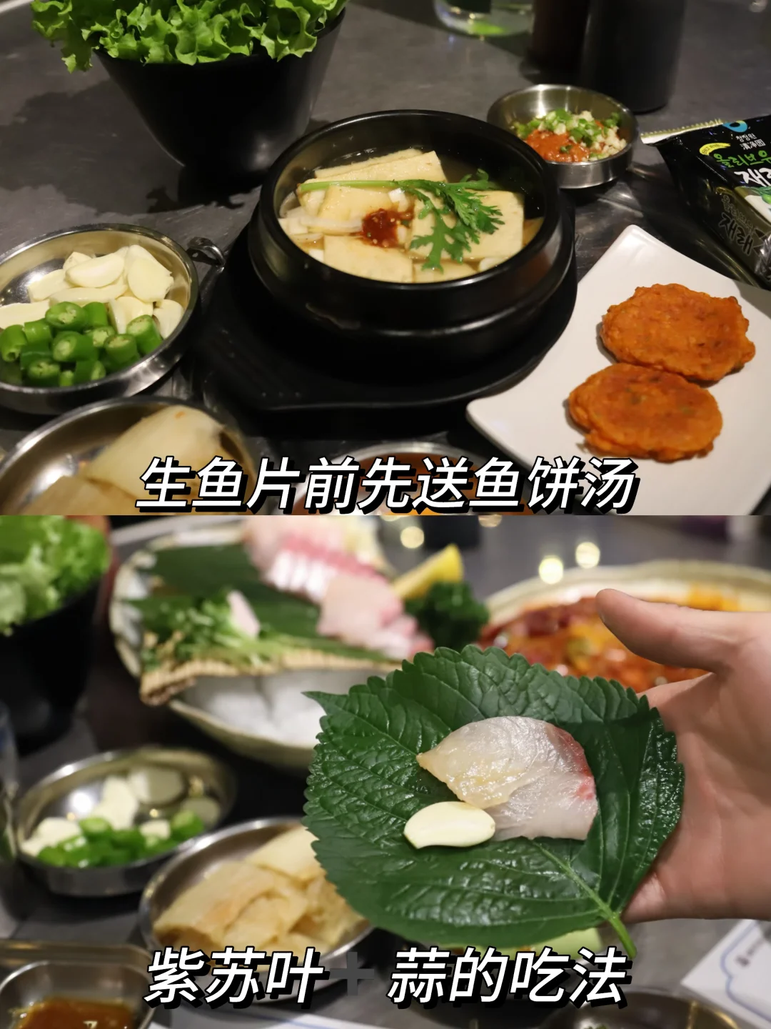 🇰🇷🇰🇷🇰🇷现杀的生鱼片真的很新鲜~韩式吃法是蘸麻油,或者紫苏叶、海苔吃,和日式不大一样