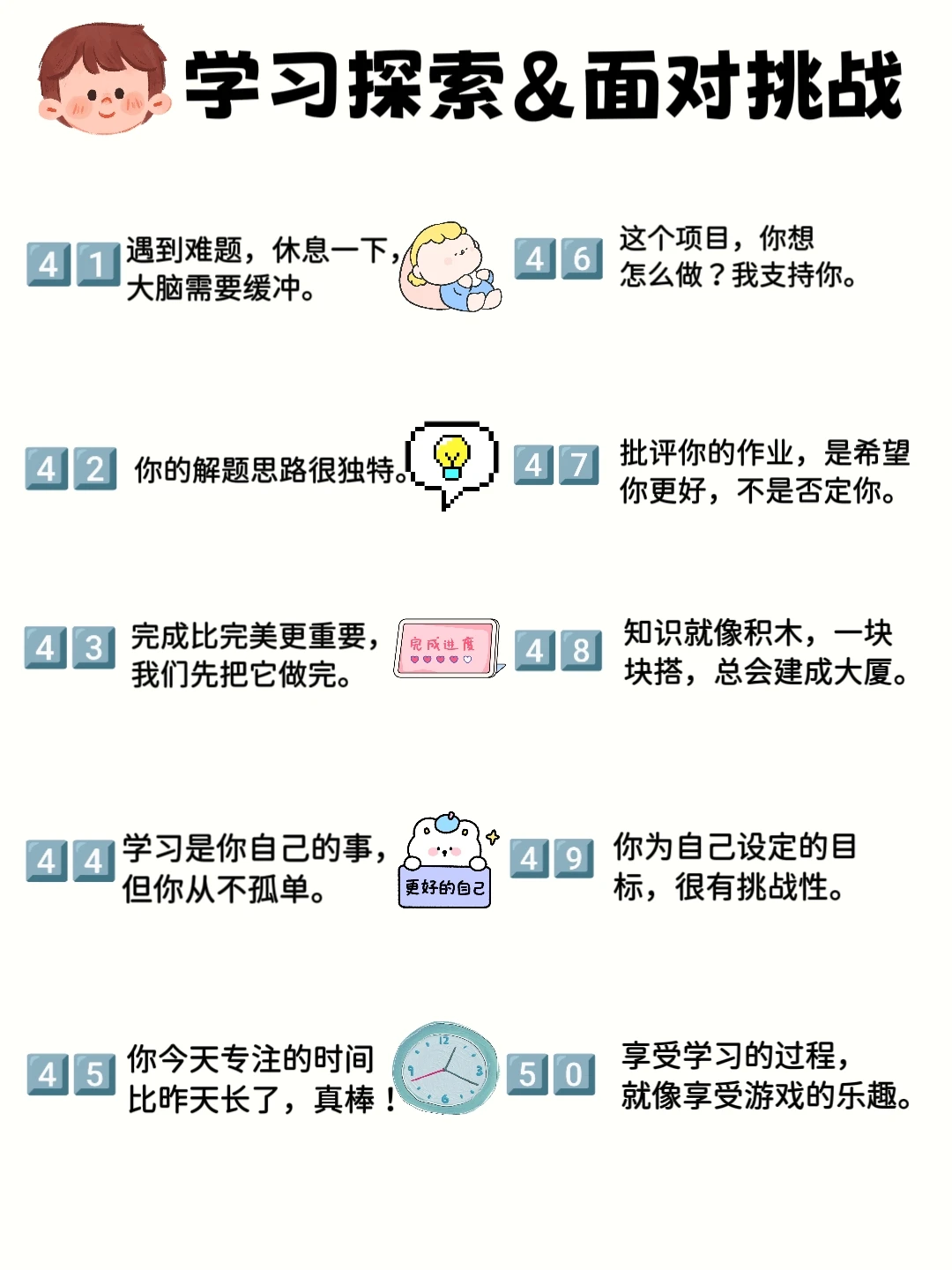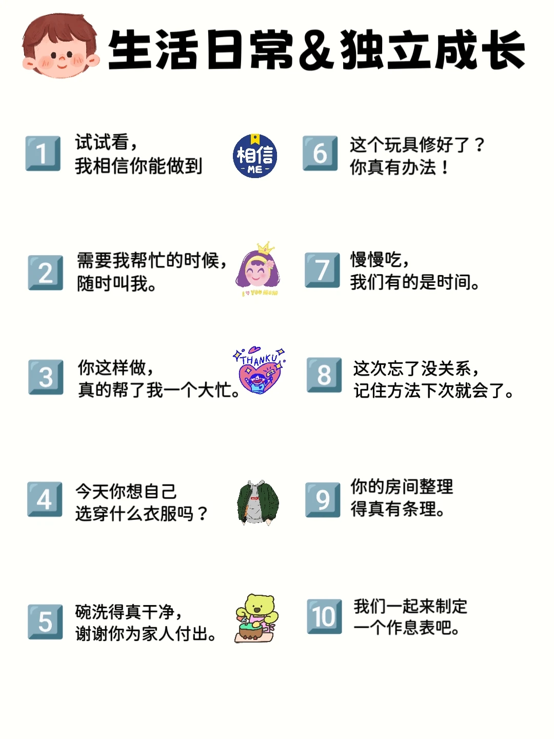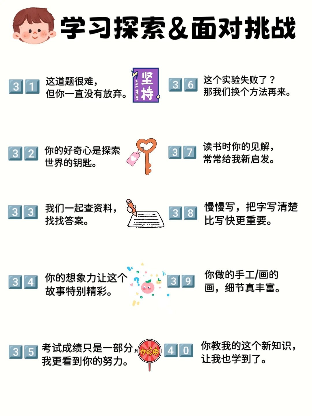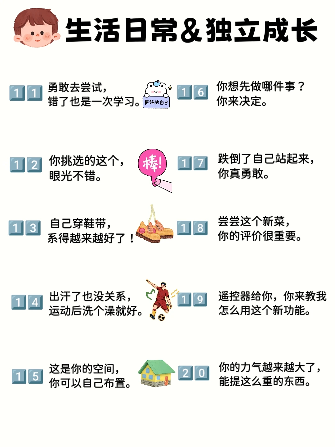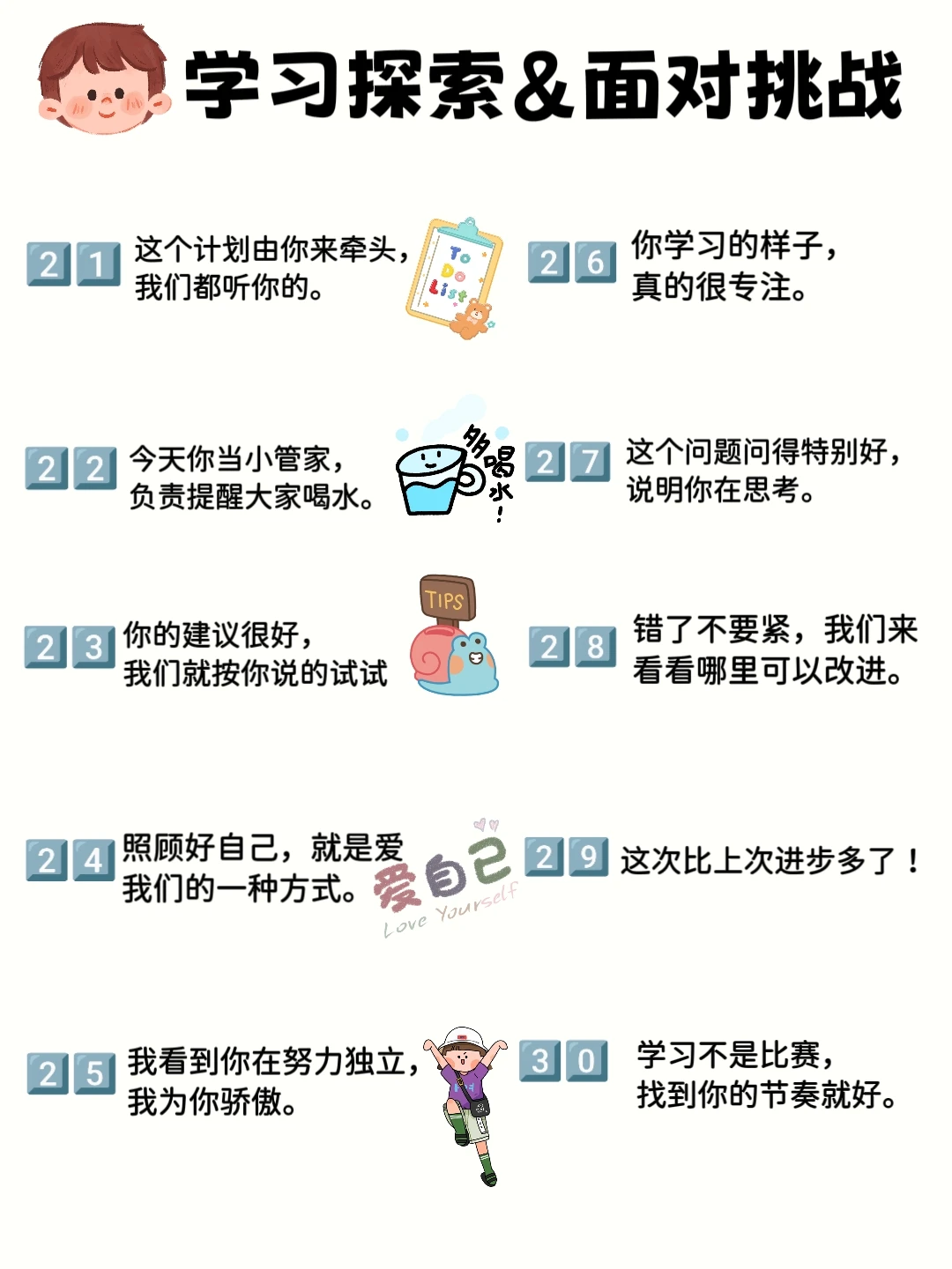 生男宝,要养成独立的人格、抗造的个性❗一定多对他说这100句话。 这些话不是清单,而是爱的种子❤️ 我们要用zui真诚的语气说给他听,给他充分的包容、信任与尊重,融入你每一天的眼神和行动中。 让宝宝确信自己被无条件地爱着时,自信和责任感便会从他心底自然生长🥰 这篇先整理50句,改天整理剩下的50句。