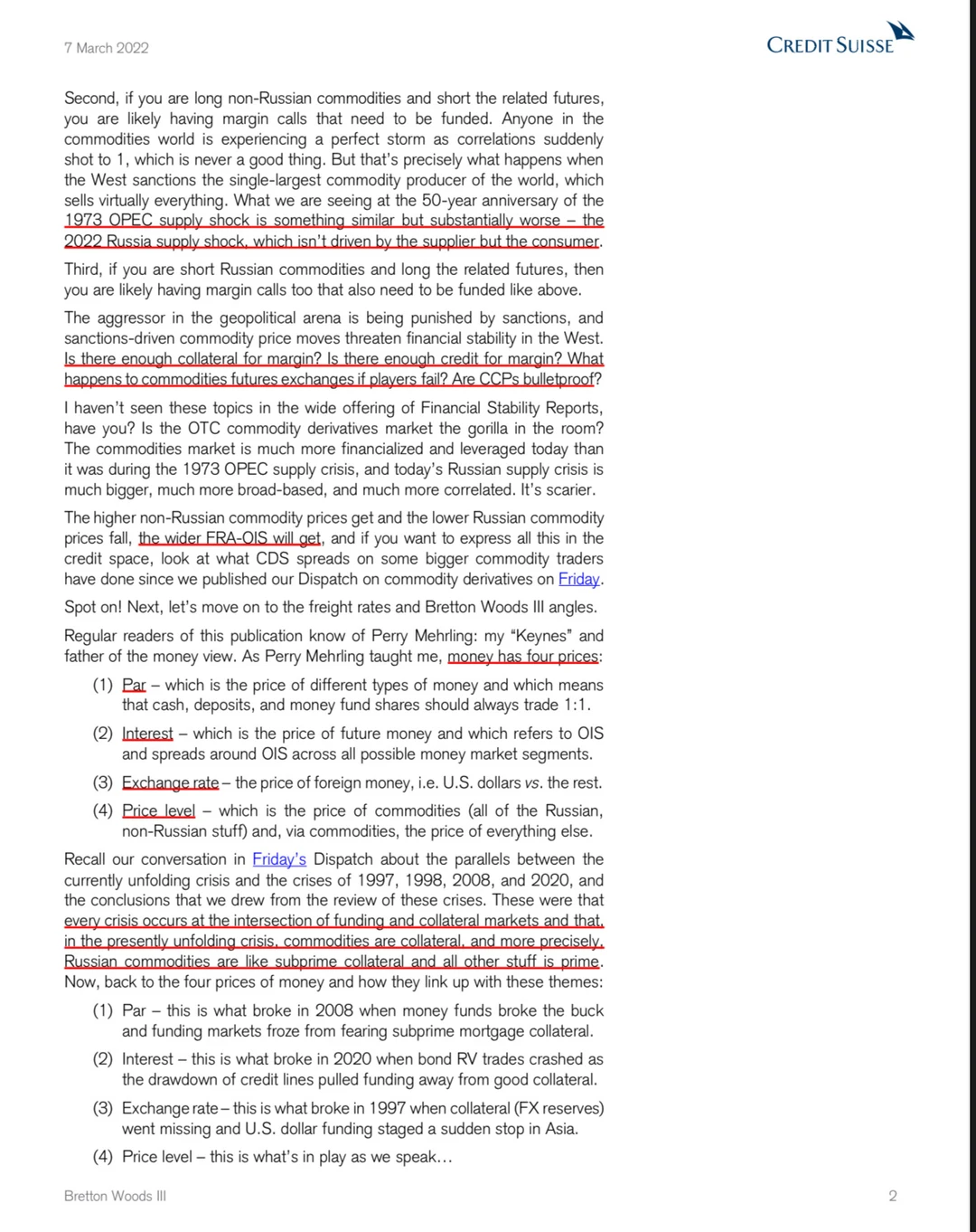 一场危机正在展开。一场大宗商品的危机。大宗商品是抵押品,而抵押品就是货币,这场危机关乎“外部货币”相对于“内部货币”(可理解为美元)日益增长的吸引力。布雷顿森林体系 II 建立在内部货币之上,当 G7 国家在一周前没收了俄罗斯的外汇储备时,其根基已经崩塌。