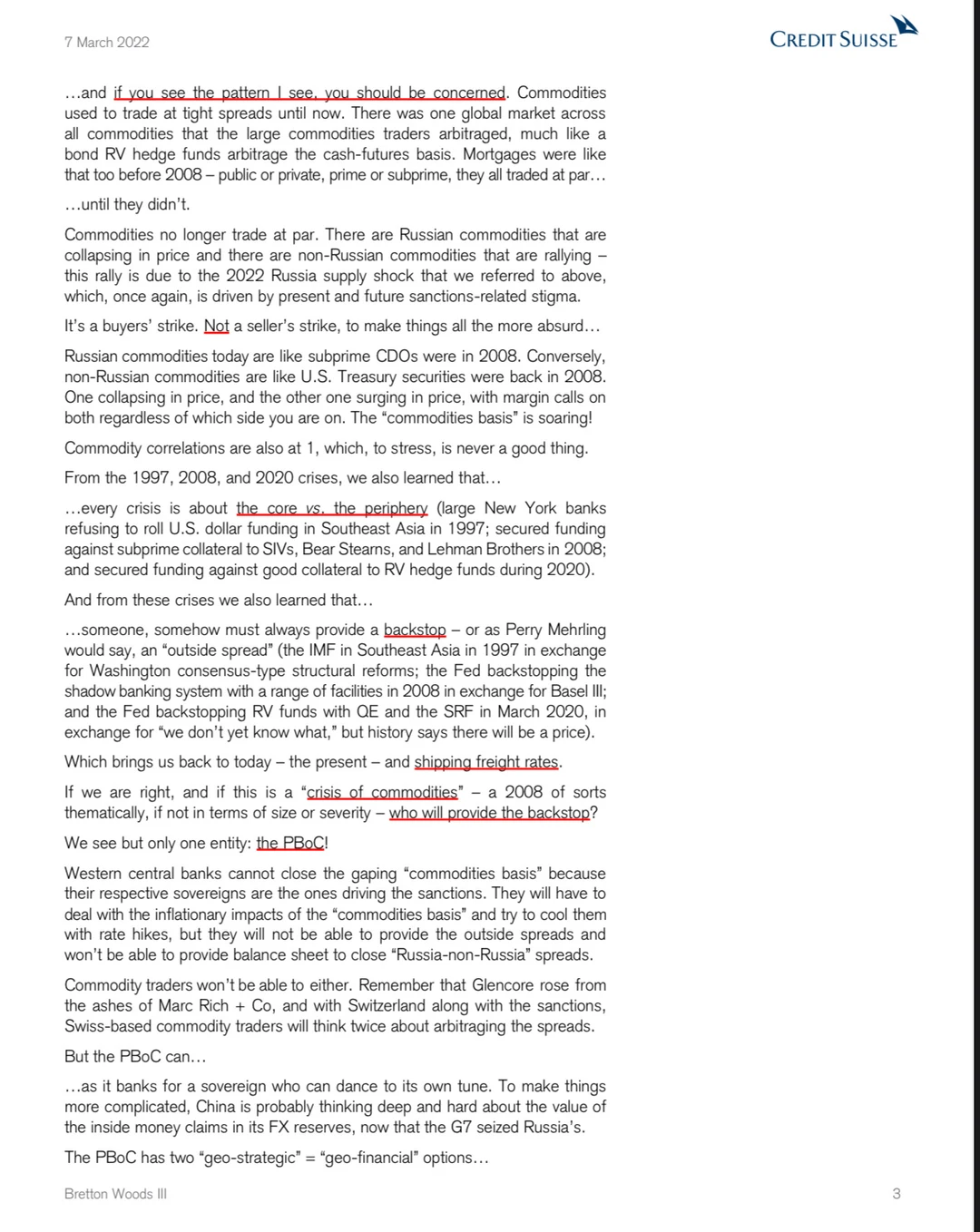CN人民银行有两个“地缘战略”即“地缘金融”选项: 1. 卖出美债以资助租赁和填充船只,以此清理次级俄罗斯商品。这将损害美债长期收益率,稳定商品基差,并让CN控制国内通胀,而西方则遭受商品短缺、衰退和更高收益率的痛苦。 2. 进行CN版的量化宽松(QE),印制RMB购买俄罗斯商品。如果是这样,这就是“欧洲人民币”市场的诞生,也是CN打破欧洲美元霸权的第一步