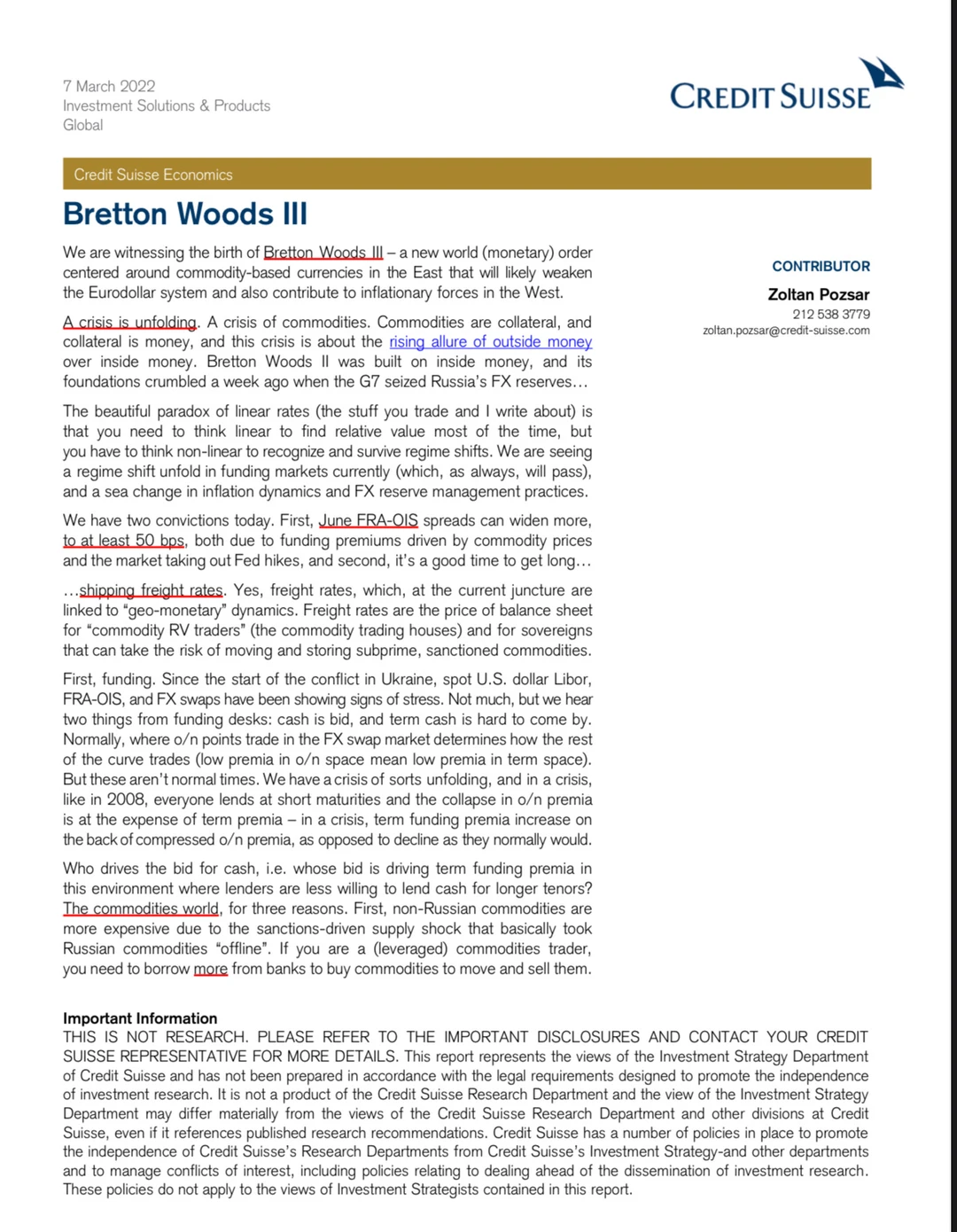 今天本来想写一篇全球货币体系变革,地缘政治影响等因素和金属类商品的关系,在我梳理信息的时候看到了Zoltan Pozsar的文章《布雷顿森林体系 III》,这是他当时在瑞信工作的时候写的,太棒了,一针见血,这还是2022年的文章…现在他自立门户了。布雷顿森林体系 III是一个系列文章,有时间的话我会通读一下,今天就摘录他这篇文章的部分内容: