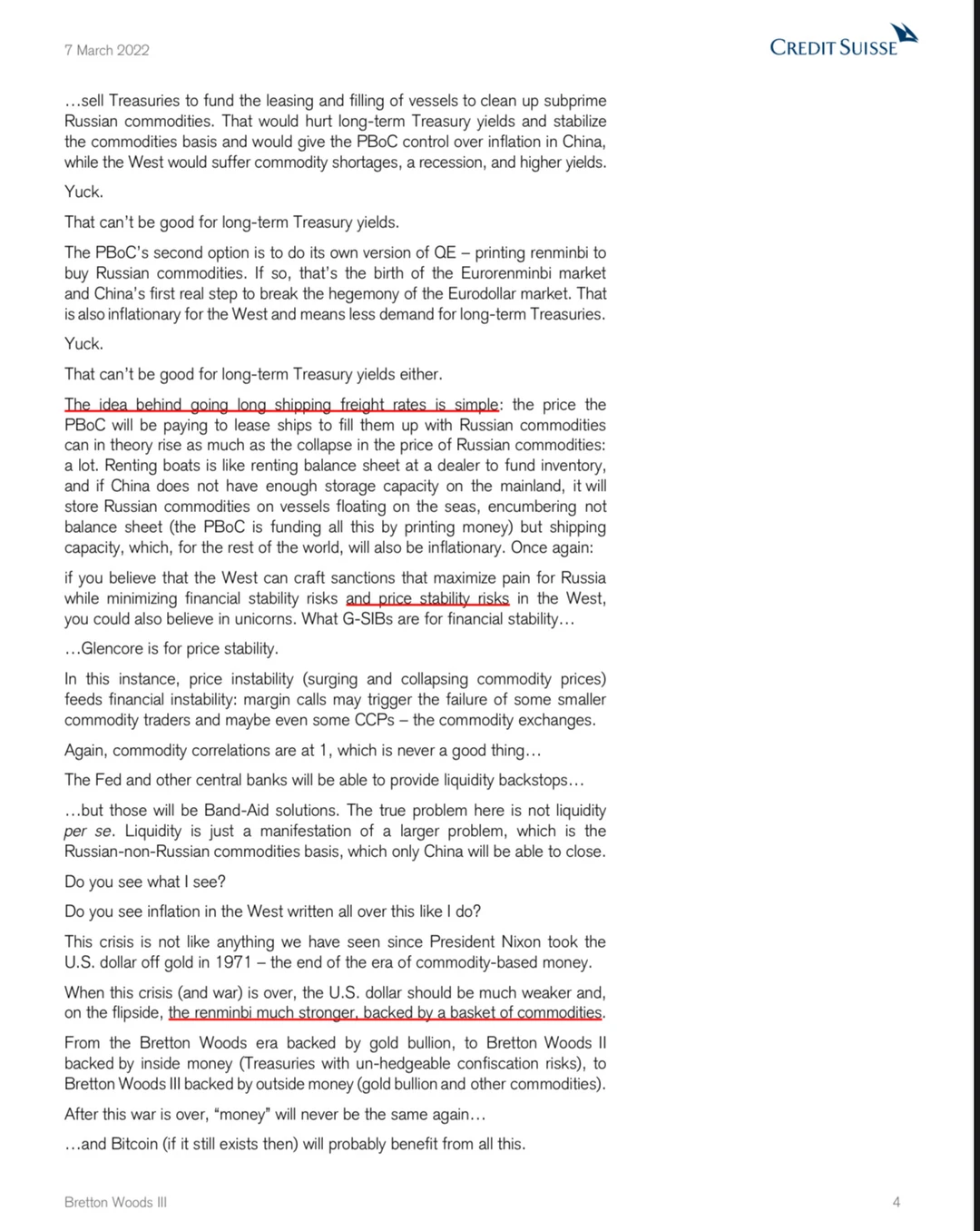 当这场危机结束时,美元应该会弱得多,而人民币则会强得多,并由一篮子商品支撑。从黄金支撑的布雷顿森林体系,到内部货币支撑的布雷顿森林体系 II,再到由外部货币(黄金和其他商品)支撑的布雷顿森林体系 III。战争结束后,“货币”将再也不一样了……而比特币可能会从中受益。