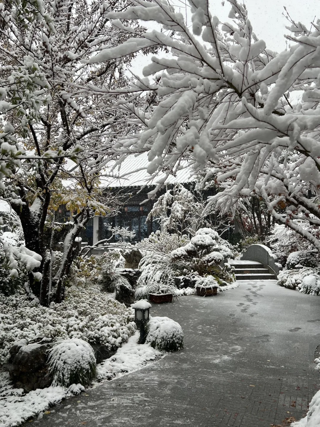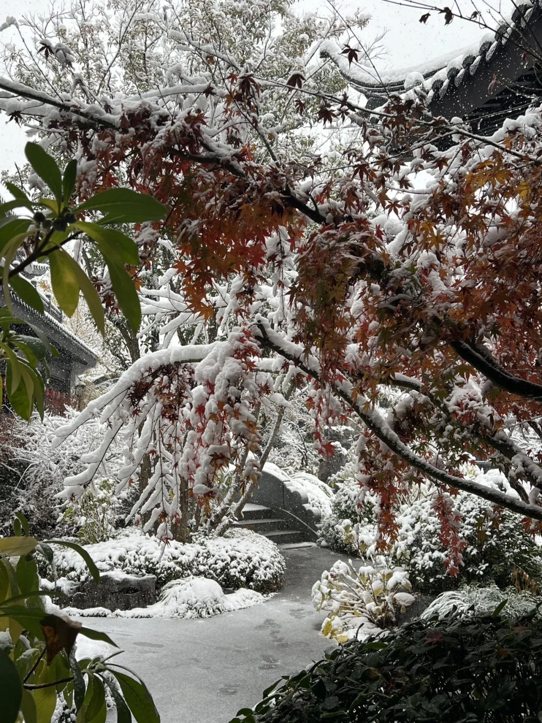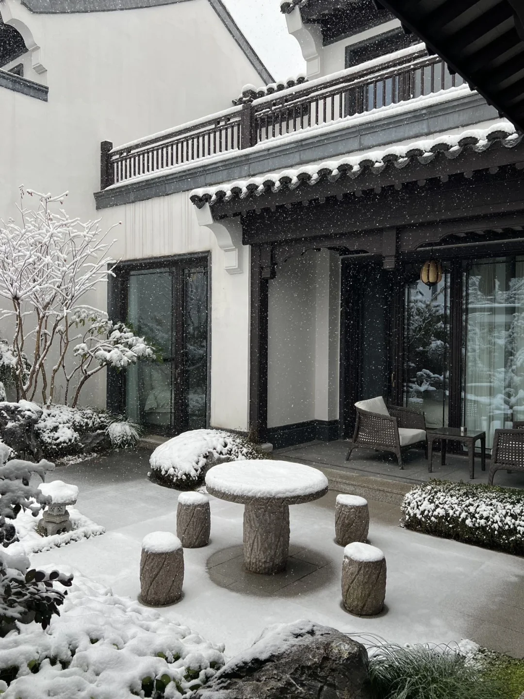 下雪天坐在院子里煮茶,看雪花簌簌落在枝头