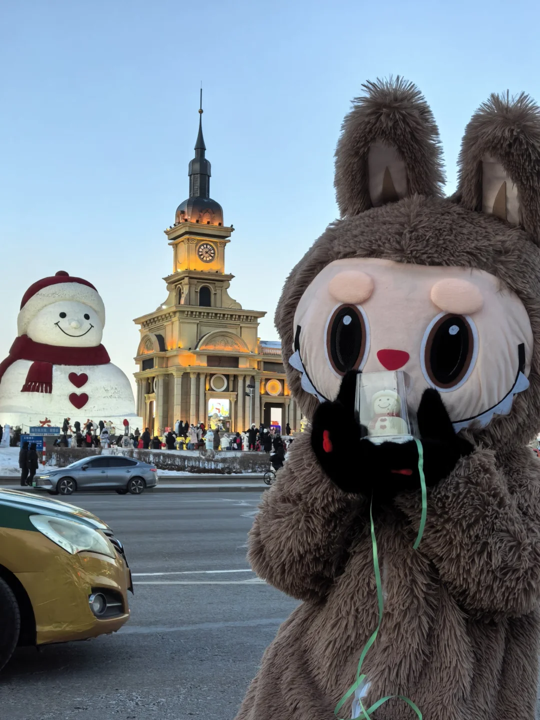 到哈尔滨了,大雪人拍了,拉布布滑梯滑了人少