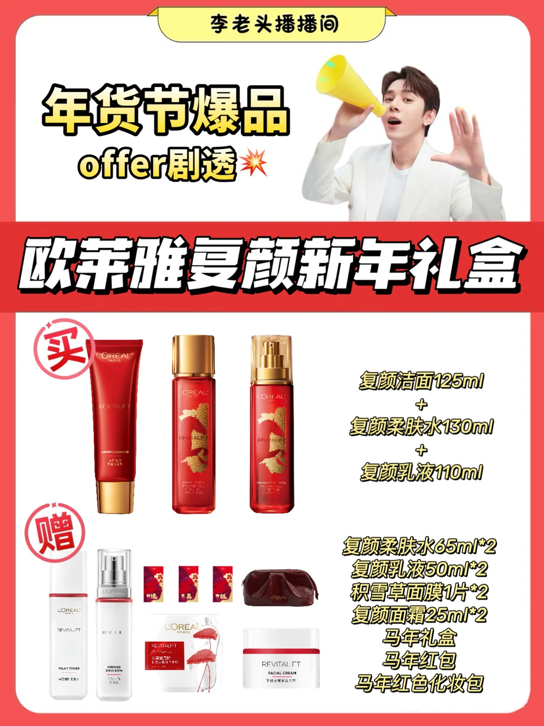 姐妹们!李佳琦年货节终于等到啦!年味越来越浓,给自己和妈妈备一份红红火火的新年护肤礼,颜值在线、寓意吉祥,这才是开年该有的仪式感~这次欧莱雅复颜新年礼盒真的值得冲——尤其咱们30+的姐妹,想要皮肤紧一点、亮一点、状态回来一点的,这盒真的像是量身定做的“复颜”套餐![赞R]