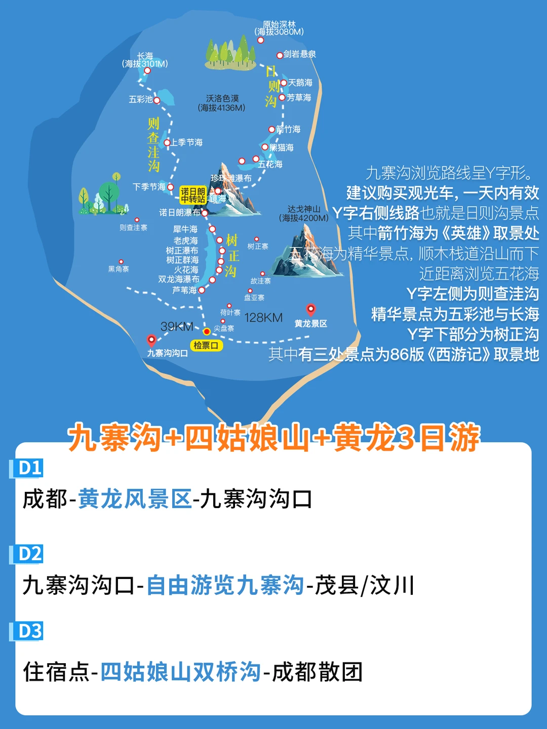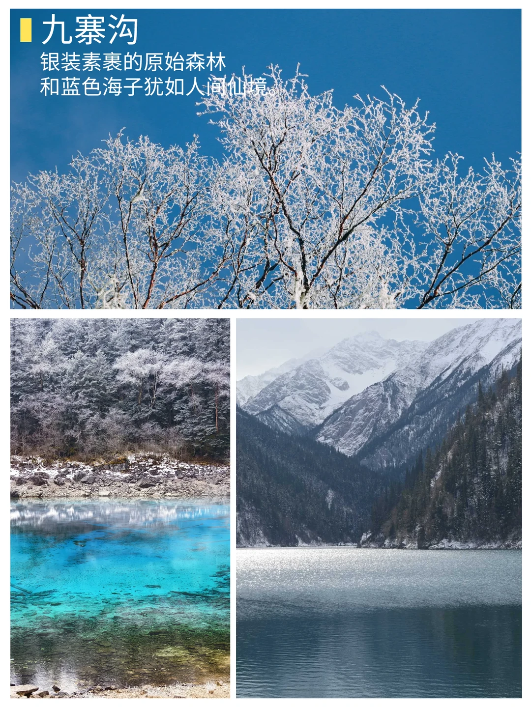 必打卡:五花海(冬天的蓝绿太绝了!)、长海(静谧的蓝冰)、诺日朗瀑布(凝固的冰瀑)。