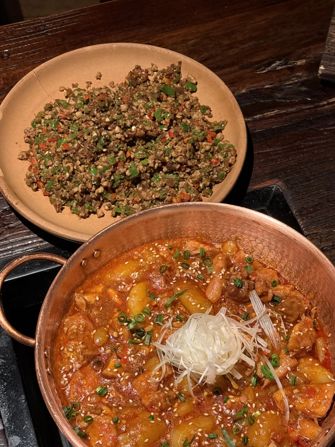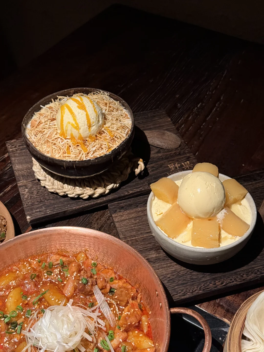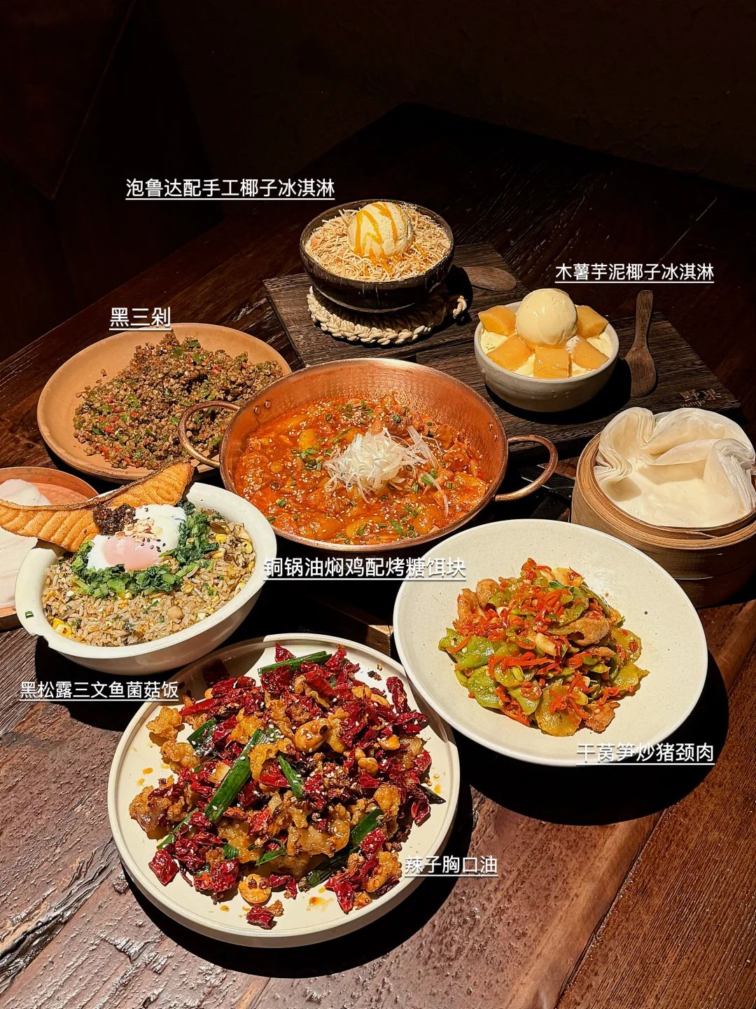 ♦️铜锅油焖鸡块配烤糖饵块 鸡肉很入味 土豆软烂入味很下饭! ♦️泡鲁达配手工椰子冰淇淋 泡鲁达浸泡之后很好吃哈哈 椰子入口很清爽解腻 ♦️辣子胸口油 蛮惊艳的不会很油腻 入口回味有奶香!很上头 ♦️干莴笋炒猪颈肉 莴笋很脆爽 猪肉也很好吃 秒空盘!必点!