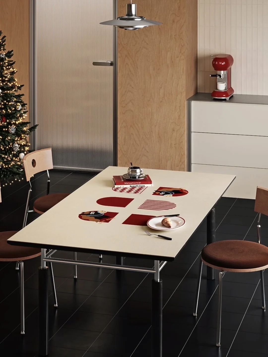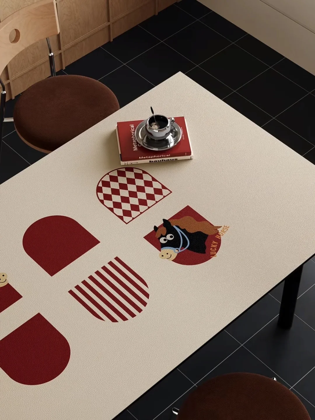 酒渍红与奶杏色打底 低调温和的复古色调 几何图形错落拼贴 增添视觉层次。 中央小拱门图案承载吉祥寓意 两侧装饰憨态小马纹样 搭配条纹与菱格元素 营造复古碰撞的趣味感 适合节日氛围 也适配日常用餐场景 -