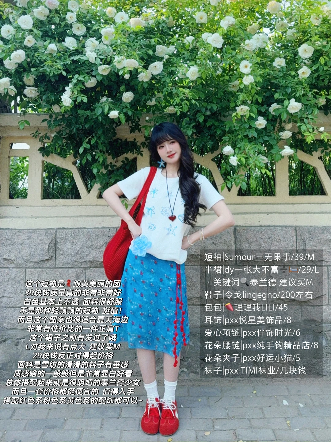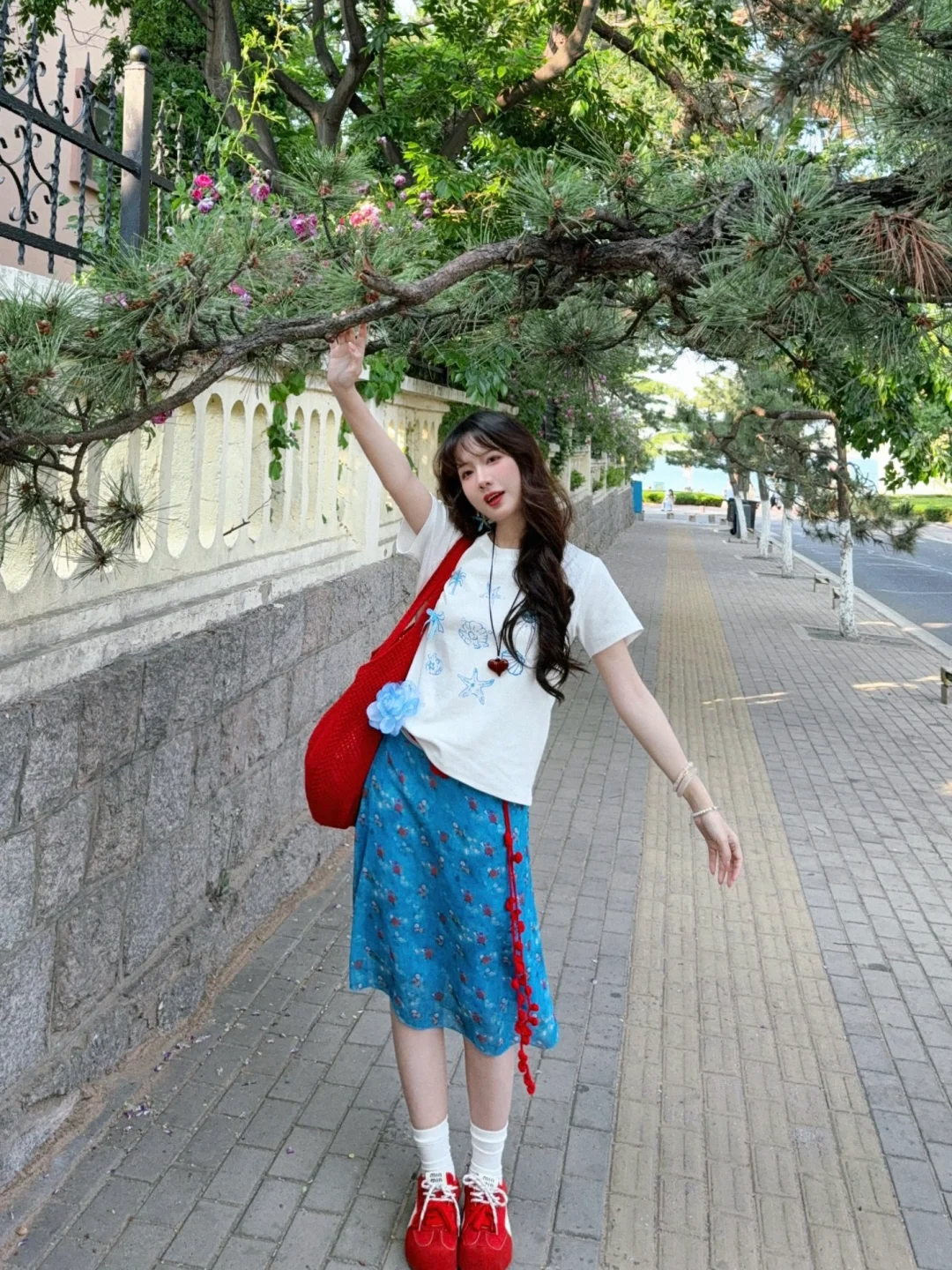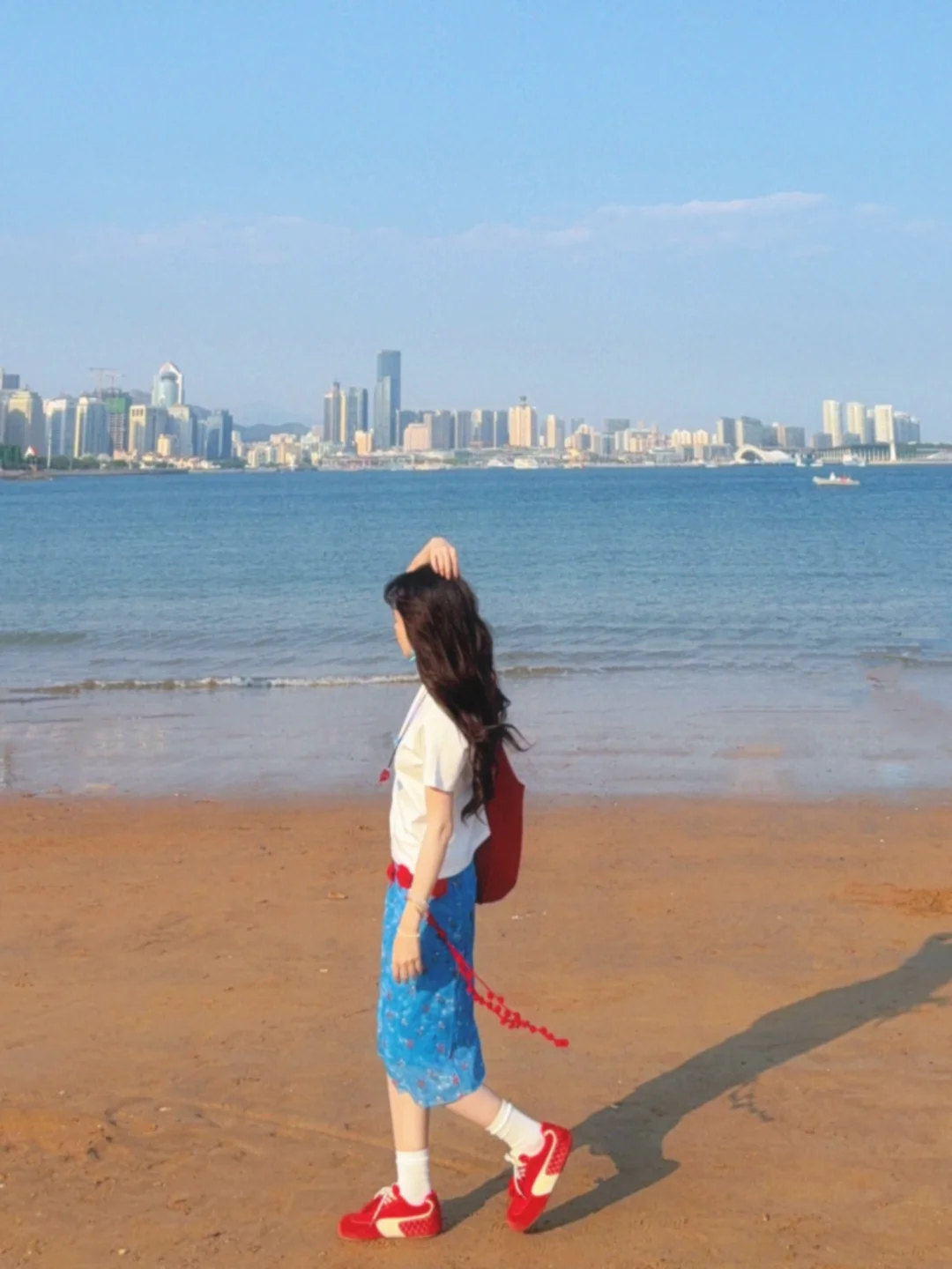 168/106左右 又是一套很平价的海岛搭配 非常非常明媚又显白的一套 性价比还蛮高嘟 值得一试 这套其实小心思还蛮多 搭配了很多配饰 确实会起到点睛之笔的作用 蓝色➕红色cp经久不衰!! 大家也可以搭配其他蓝色系的裙子或者裤子 也是很好看的 也可以直接搭配红裙子 反正红色蓝色白色三个颜色组合不会出错~ 拍照地点📍青岛 第二海水浴场附近