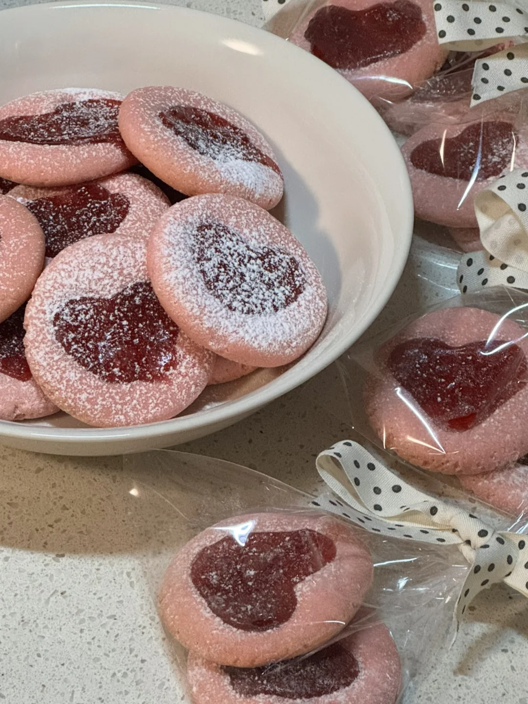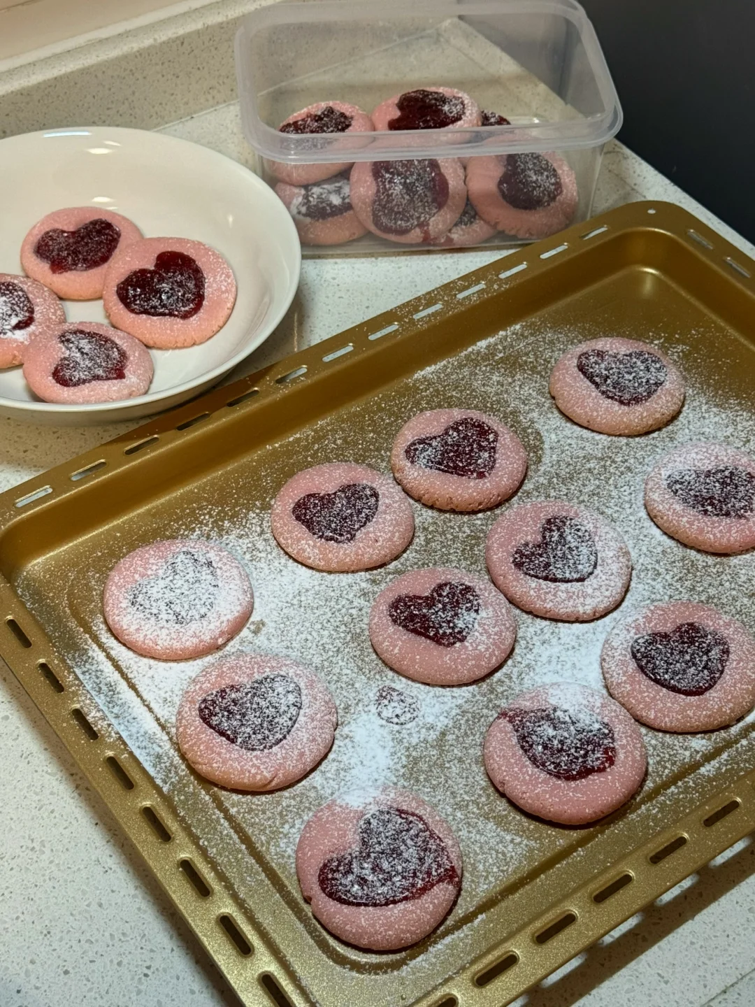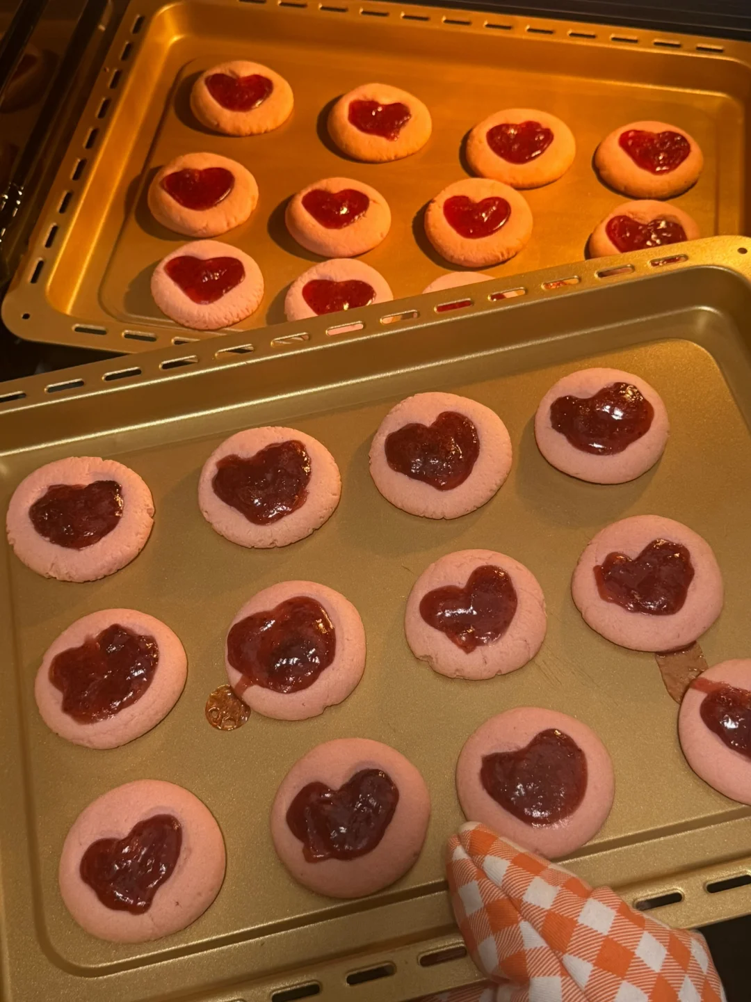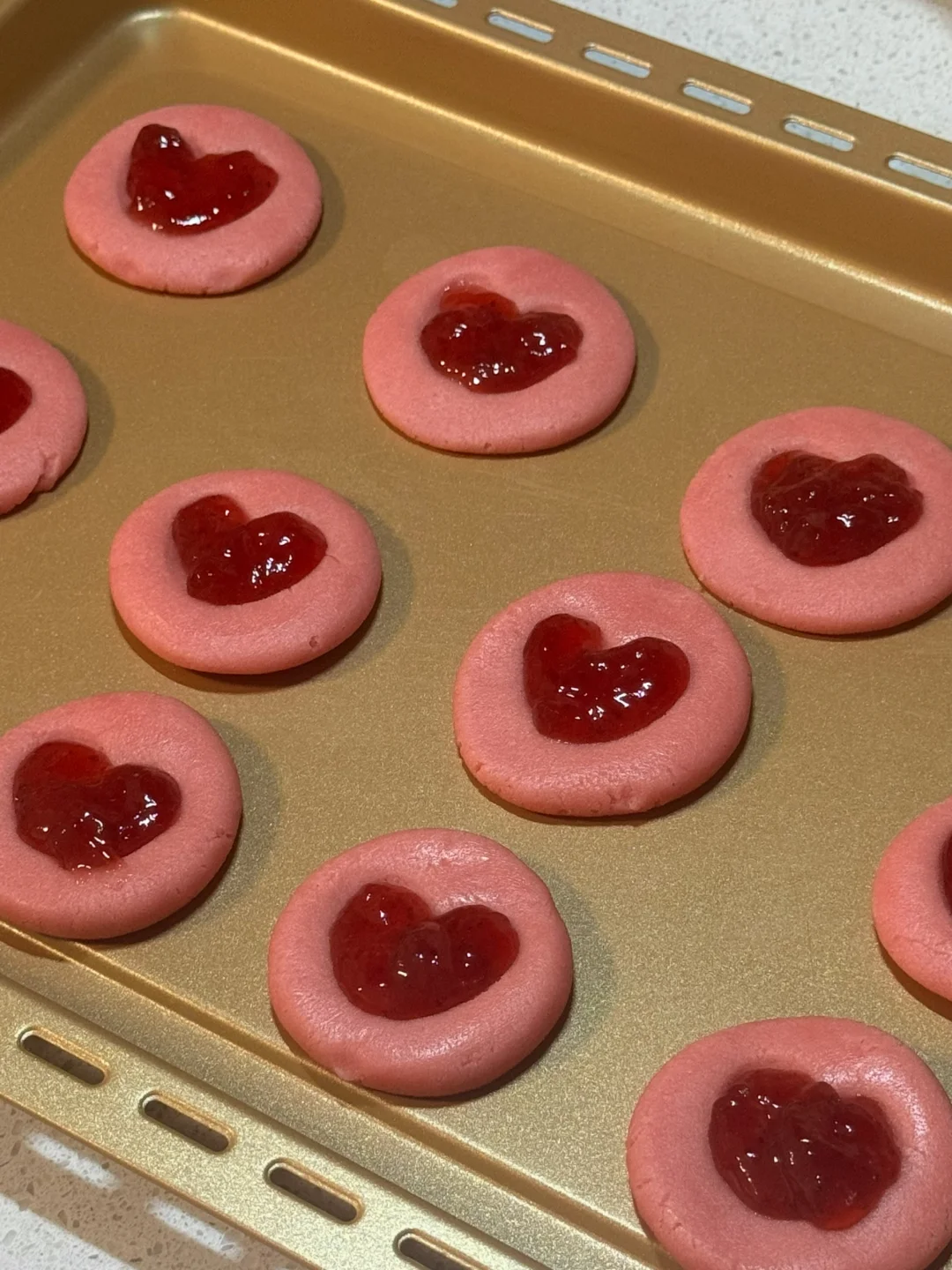 💗食材: 黄油150g 糖粉80g 全蛋液75g 低筋面粉250g 奶粉45g 仙人掌果粉5g 草莓果酱 💗做法: 1.软化后的黄油加入糖粉打发至蓬松发白,蛋液分次加入(每次打发均匀后再加下一次,打发均匀) 2.筛入低粉、奶粉、仙人掌果粉翻拌均匀,再下手揉成团(不要多度揉搓防止起筋)均分成20g一个,揉圆再按扁,用大拇指按压出爱心的形状,草莓酱装入裱花袋挤入凹陷处。 3.烤箱提前预热,160度烘烤20分钟。 🌷好看又好吃的曲奇,饼干酥脆果酱流心[派对R][派对R][派对R]