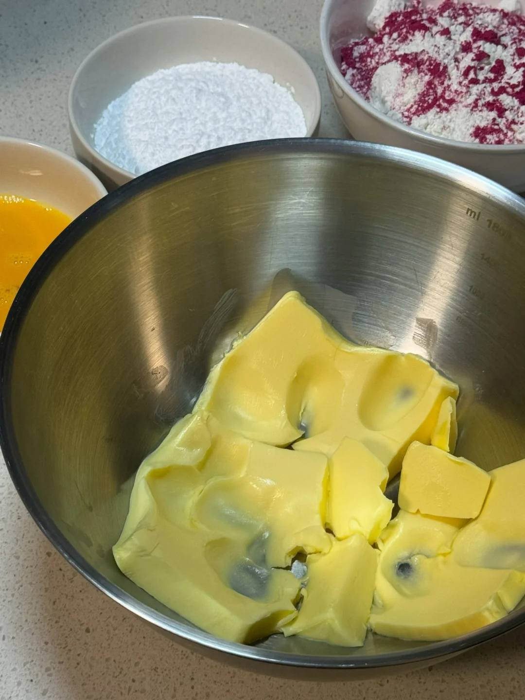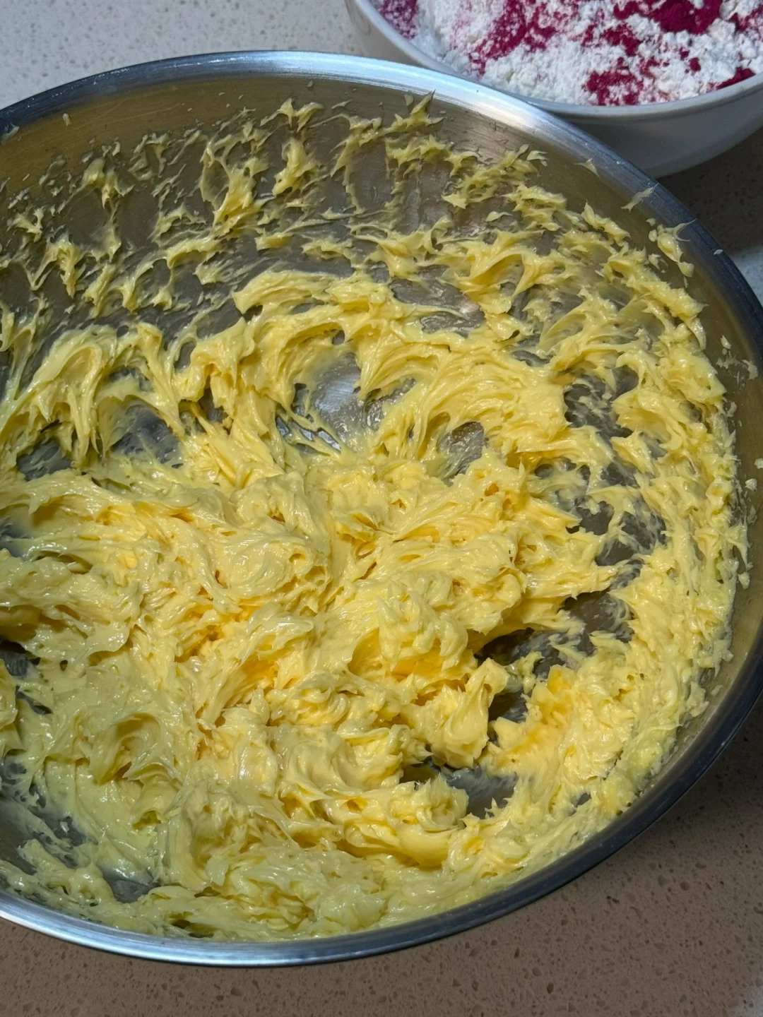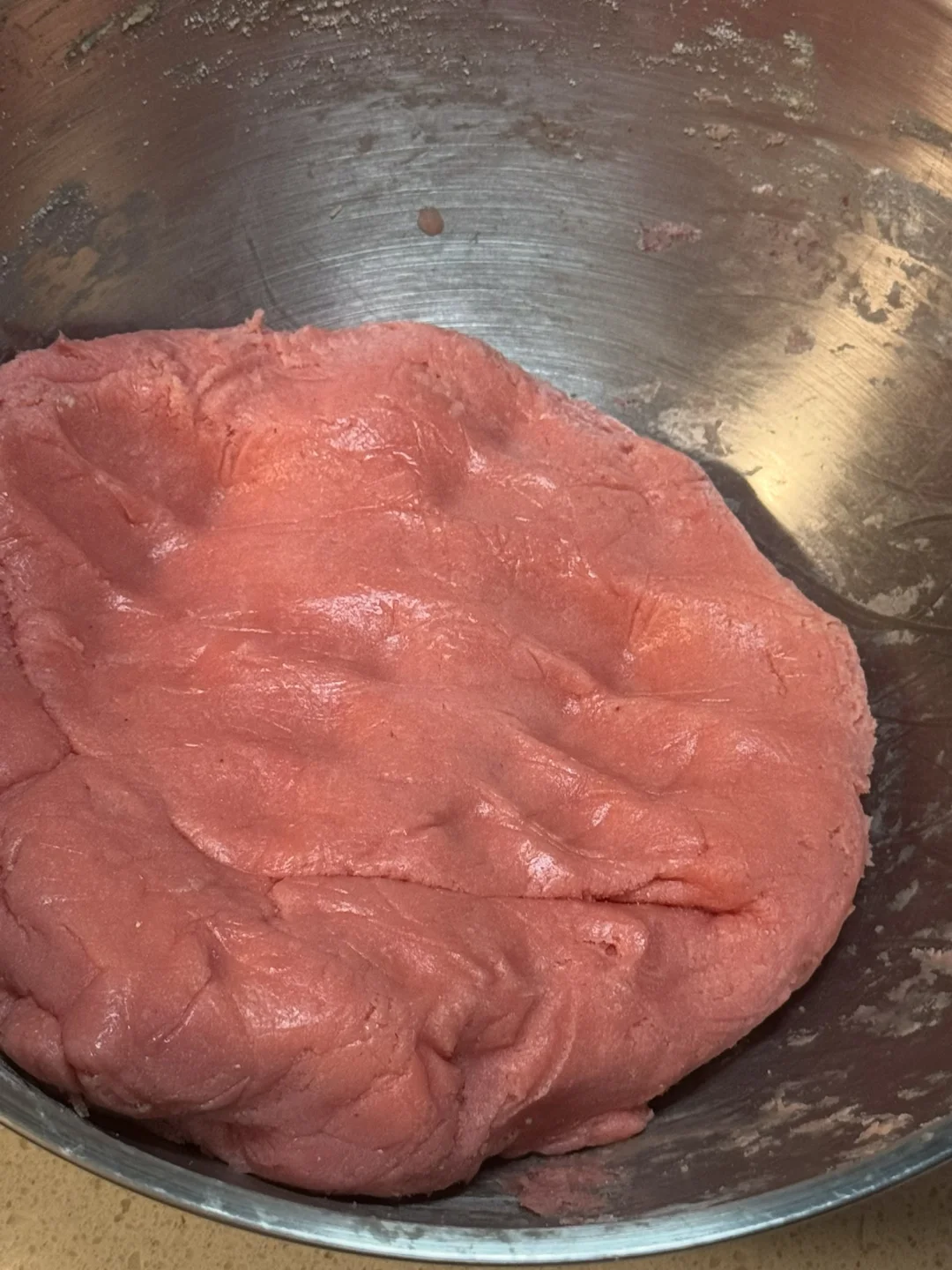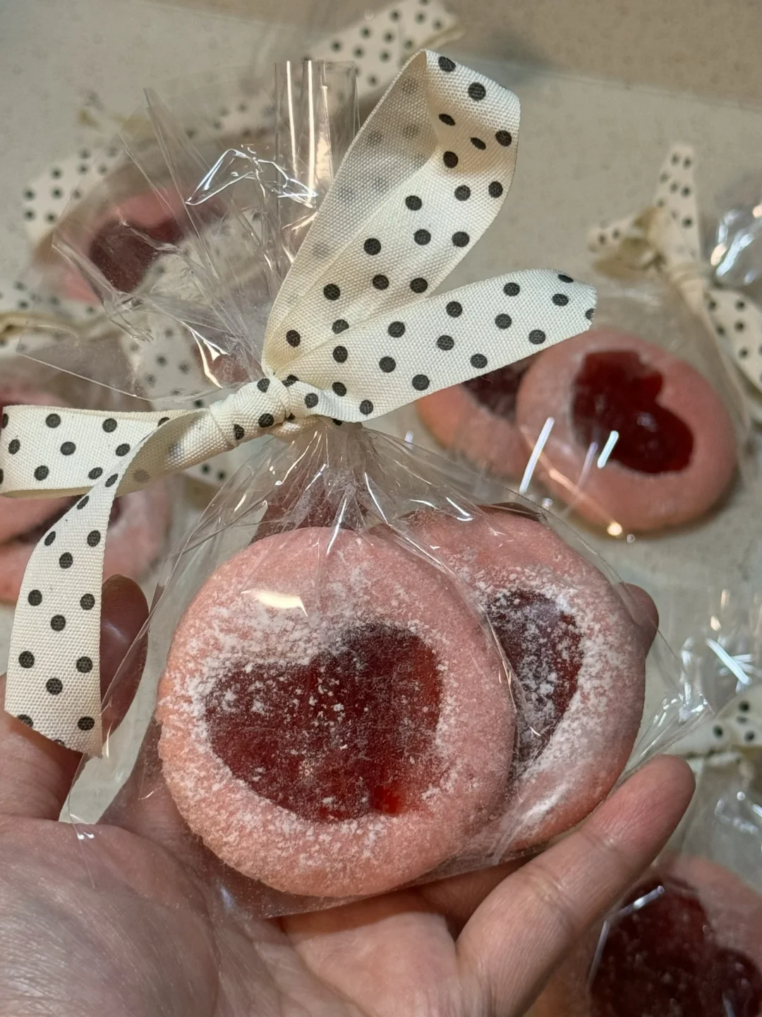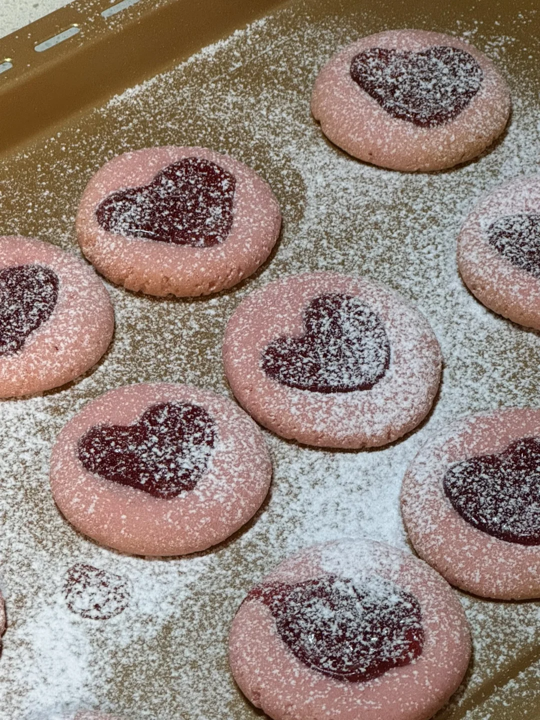 💗食材: 黄油150g 糖粉80g 全蛋液75g 低筋面粉250g 奶粉45g 仙人掌果粉5g 草莓果酱 💗做法: 1.软化后的黄油加入糖粉打发至蓬松发白,蛋液分次加入(每次打发均匀后再加下一次,打发均匀) 2.筛入低粉、奶粉、仙人掌果粉翻拌均匀,再下手揉成团(不要多度揉搓防止起筋)均分成20g一个,揉圆再按扁,用大拇指按压出爱心的形状,草莓酱装入裱花袋挤入凹陷处。 3.烤箱提前预热,160度烘烤20分钟。 🌷好看又好吃的曲奇,饼干酥脆果酱流心[派对R][派对R][派对R]