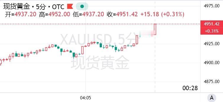现货黄金上破4950美元,现货黄金盘初站上4950美元/盎司关口,再创历史新高,
