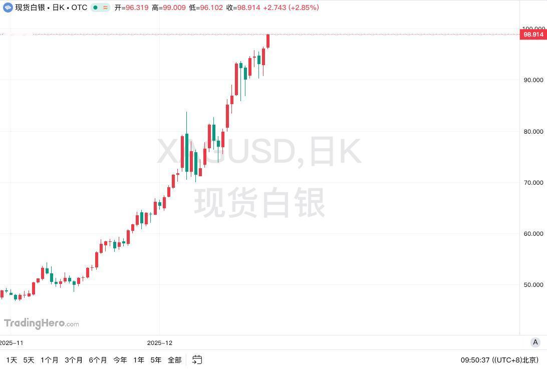 现货白银突破99美元关口 现货白银首次站上99美元/盎司,新年首月涨超38%。[
