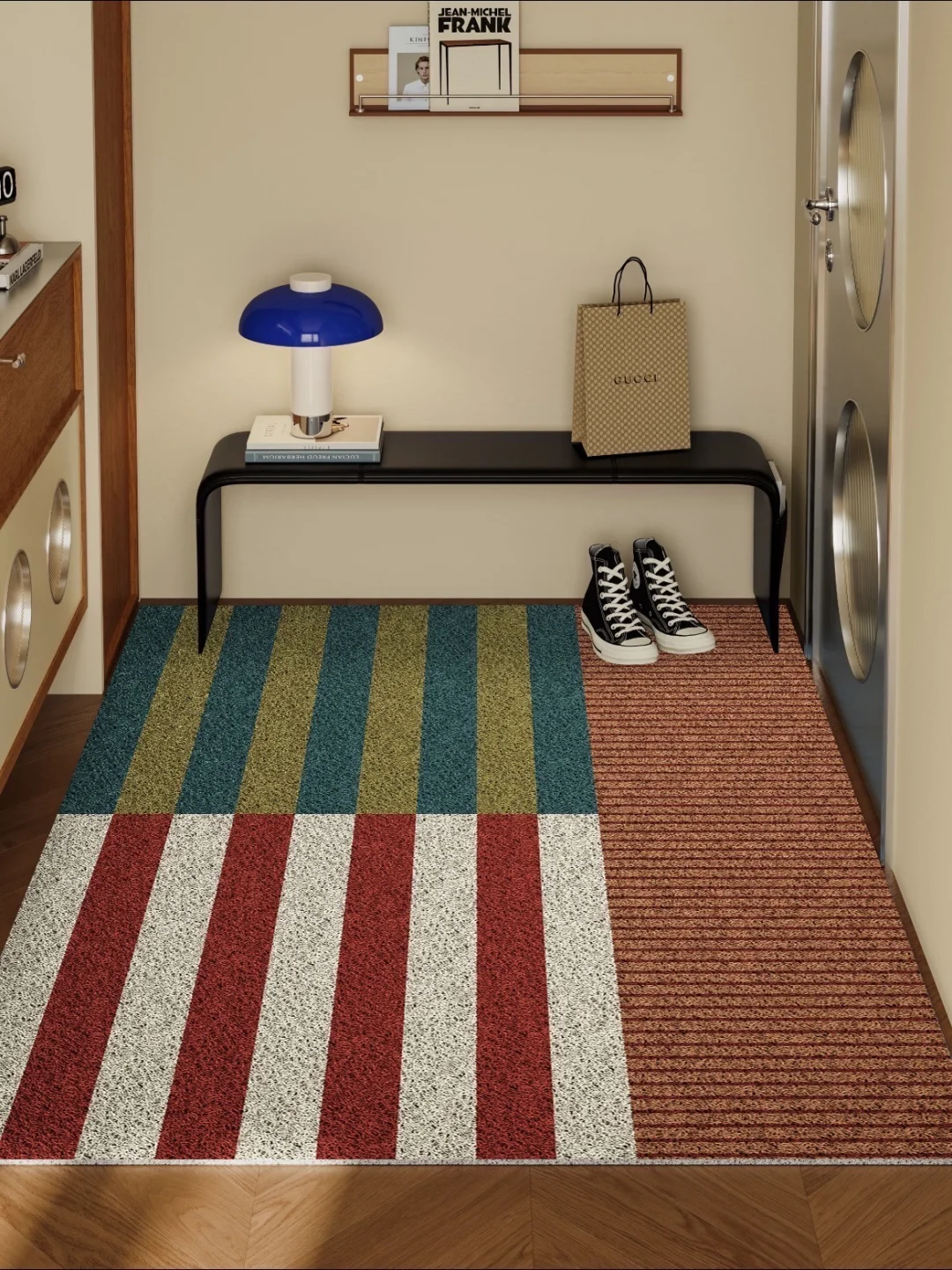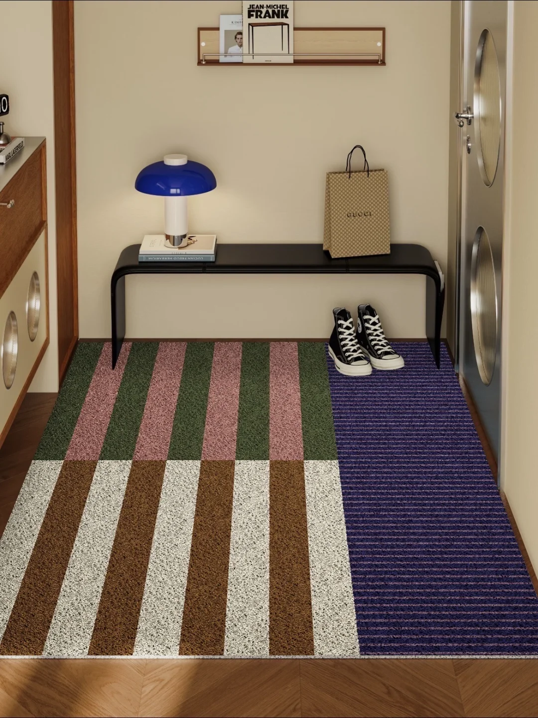 柯布西耶的经典配色与条纹元素结合 自带沉静又明快的艺术气质 整张地垫采用低饱和撞色条纹 色块分割清晰却不突兀 摆进玄关 瞬间带出复古又现代的氛围 -