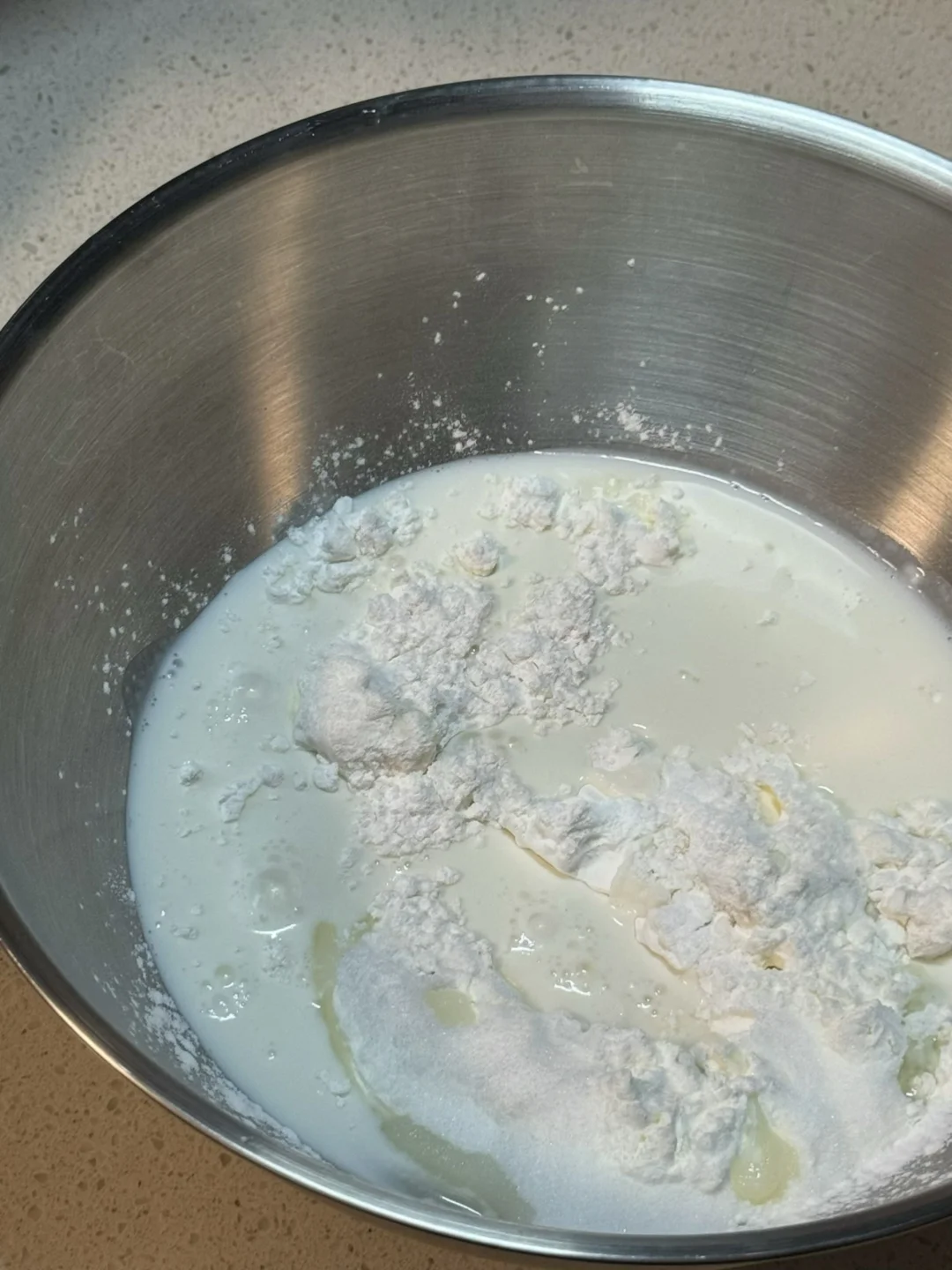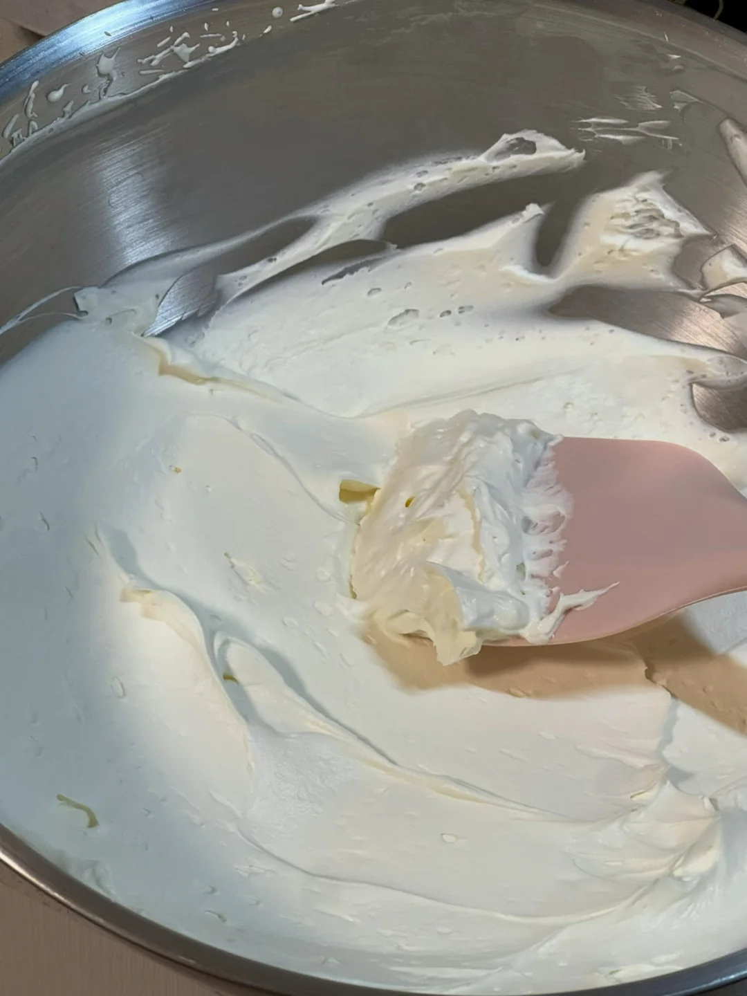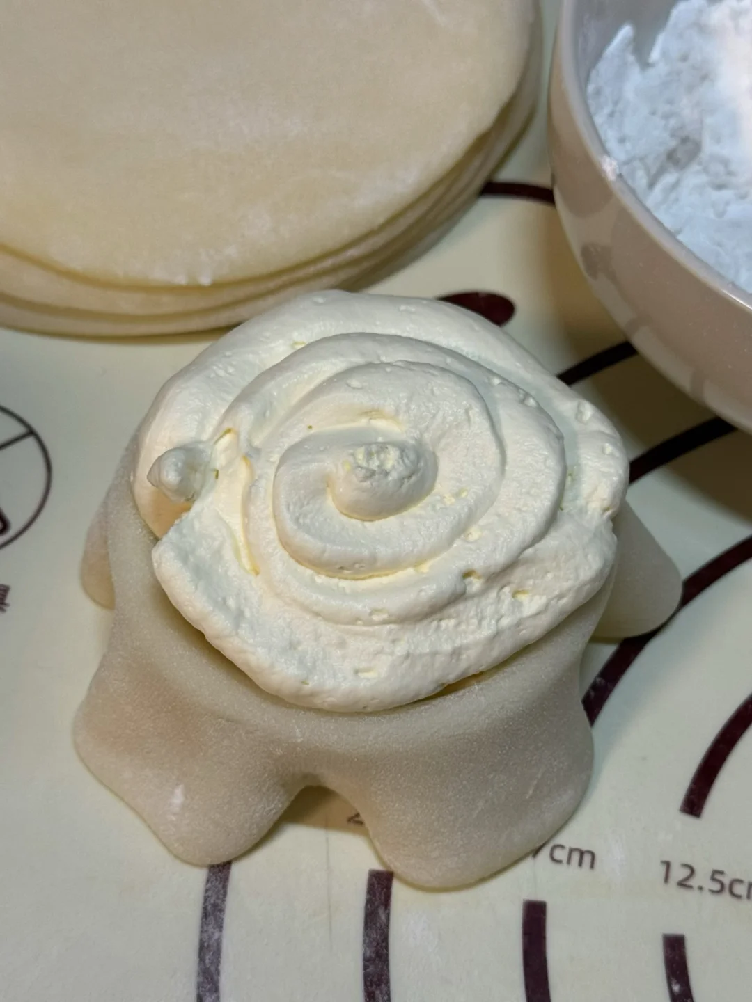 🌷食材(此配方可做9个雪媚娘) 水磨糯米粉100g 黄油20g 玉米淀粉30g 牛奶170g 糖30g 奶油350g 芒果 熟糯米粉 🌷做法: 1.糯米粉、细砂糖、玉米淀粉、纯牛奶搅拌均匀。 2.过筛后裹上保鲜膜扎几个小孔,放进蒸锅蒸30分钟。 3.蒸熟后稍微凉一点拿出来跟黄油混合均匀,不停拉扯使黄油融入面团(多拉扯几下,会更有韧劲)裹上保鲜膜放冰箱冷藏1小时。 4、冷藏后面团均分成9份,擀成一个个圆形面皮(放熟糯米粉,避免粘连) 5.奶油350g,细砂糖15g打发至硬挺。 6.擀好的面皮放入模具中,挤上奶油、放入芒果,包包子一样包住,多余的用剪刀剪掉。做好的雪媚娘可以放冰箱冷藏一小时后再享用,口感会更好哦! 🌷超级糯叽叽,亲测这个雪媚娘皮放到第二天也不会硬,软糯香甜,快去试试吧!