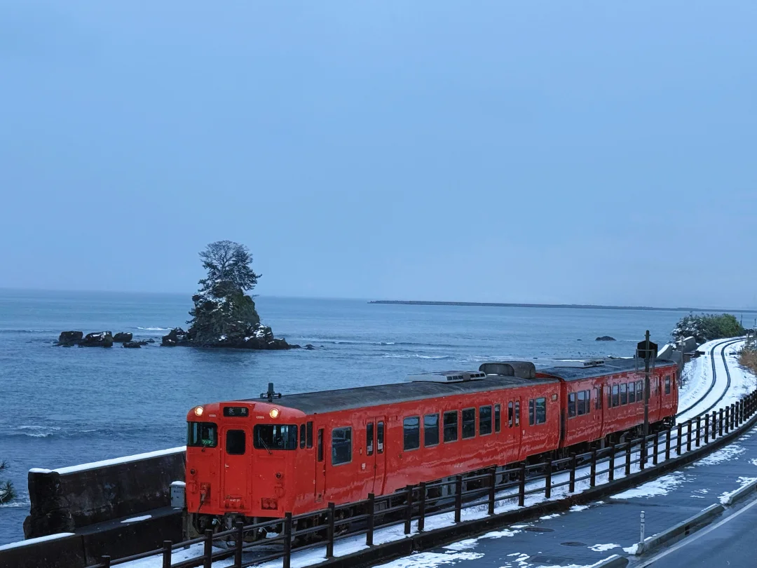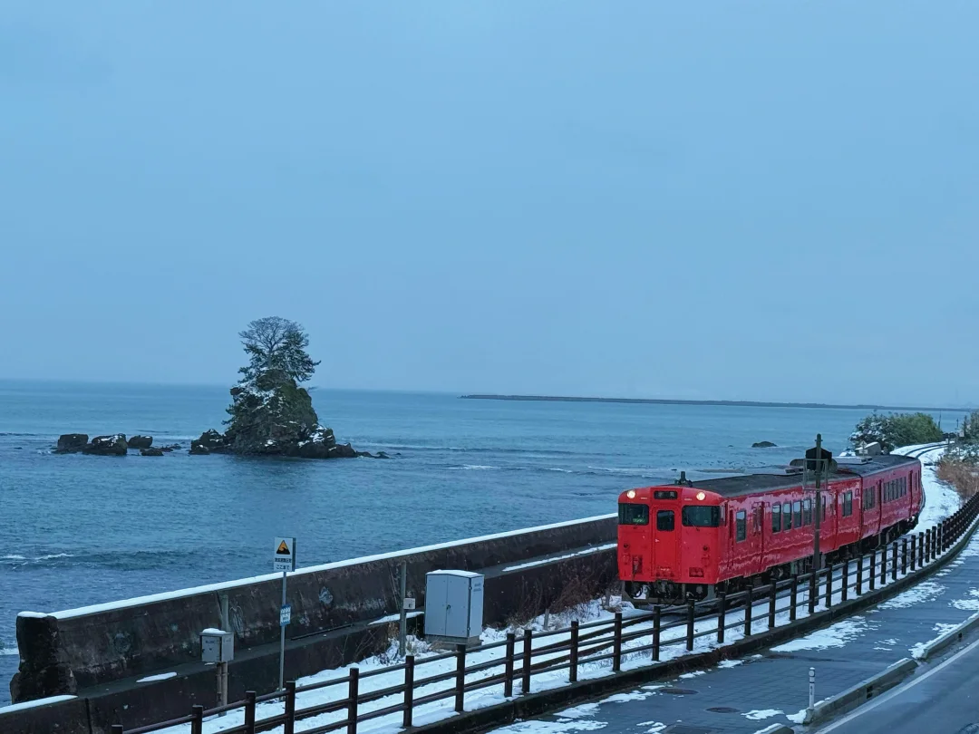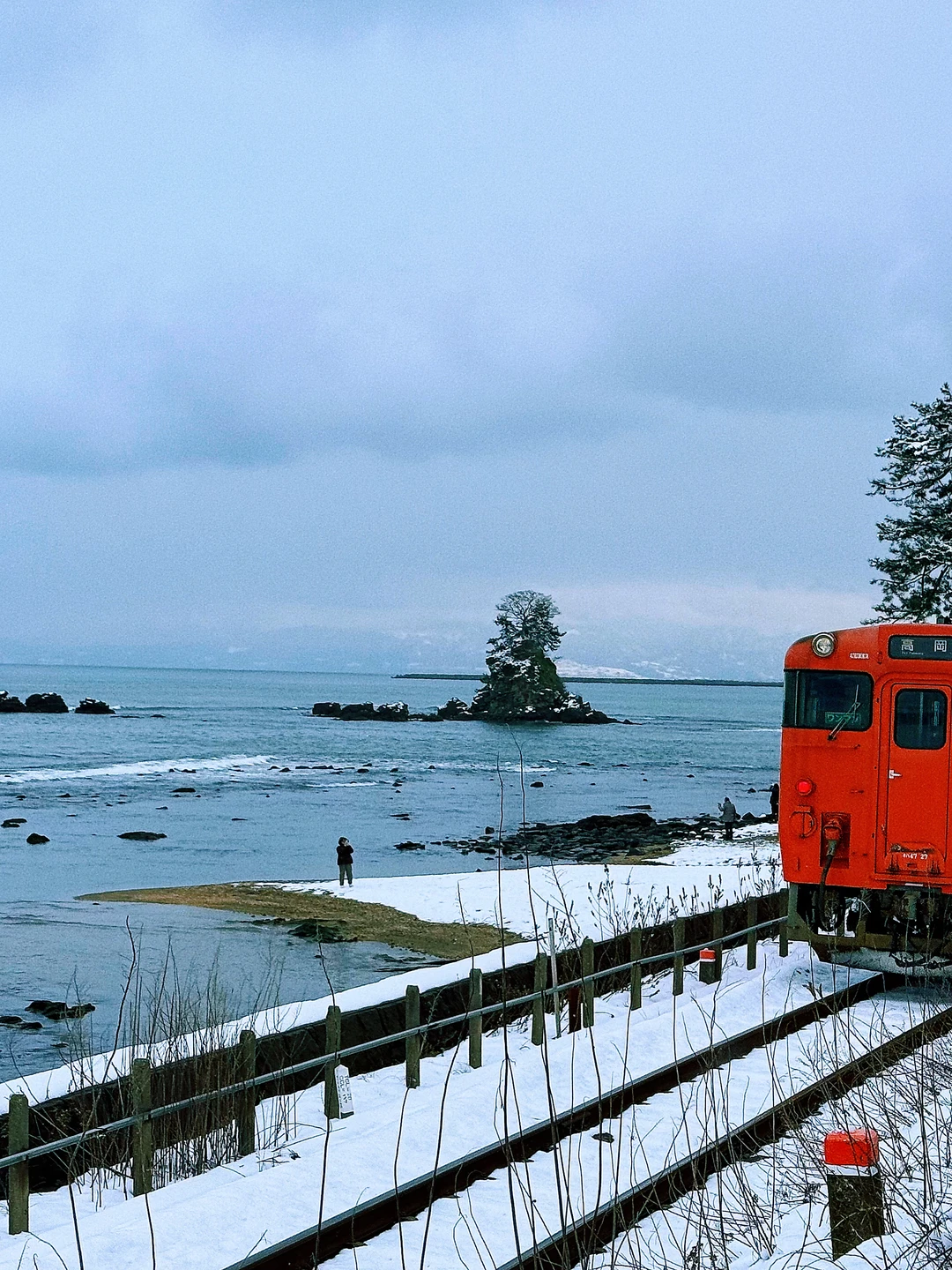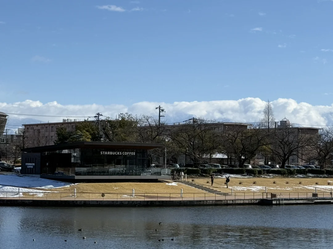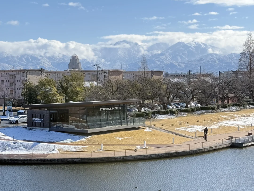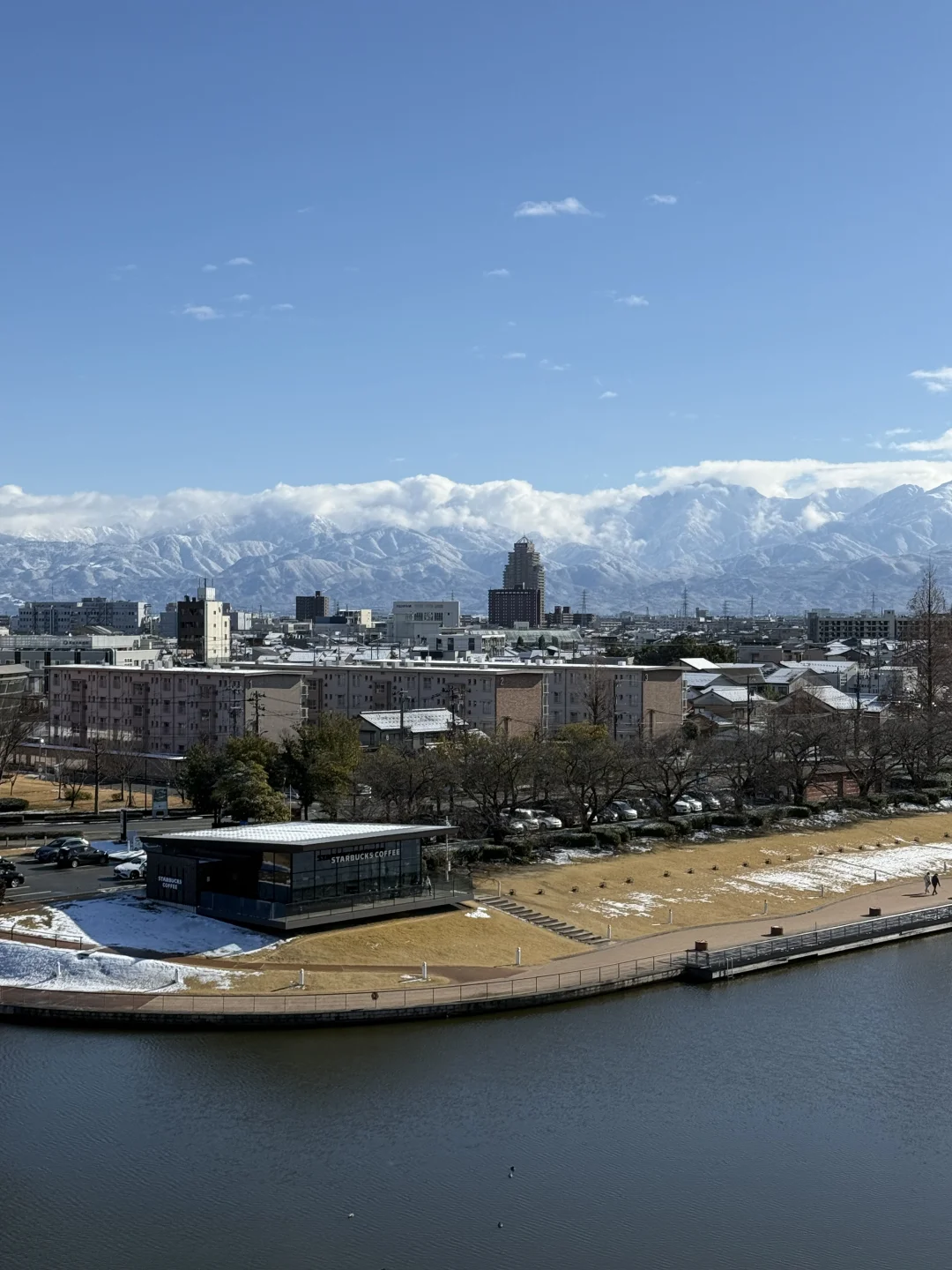 1.21 上午从富山站步行15分钟即到传说中的最美星巴克(富山环水公园),星巴克旁的塔桥上的瞭望台有最佳取景点 晴天可以拍到远方的雪山; 下午在富山站坐“爱之风富山铁道”至高冈换乘“JR冰见线”到雨晴 抵达时还能看到的雪山在临走前就因为开始下雪而消失不见了~