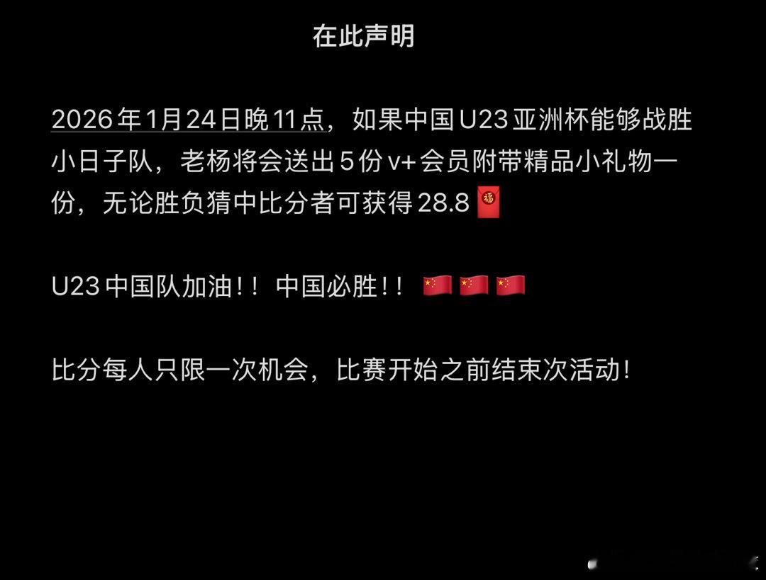 2026年1月24日晚11点,如果中国U23亚洲杯能够战胜小日子队,老杨将会送出5份v+会员附带精美礼物一份,无论胜负猜中比分者可获得28.8.U23中国队加油!!中国必胜!!U23国足争气争气再争气
