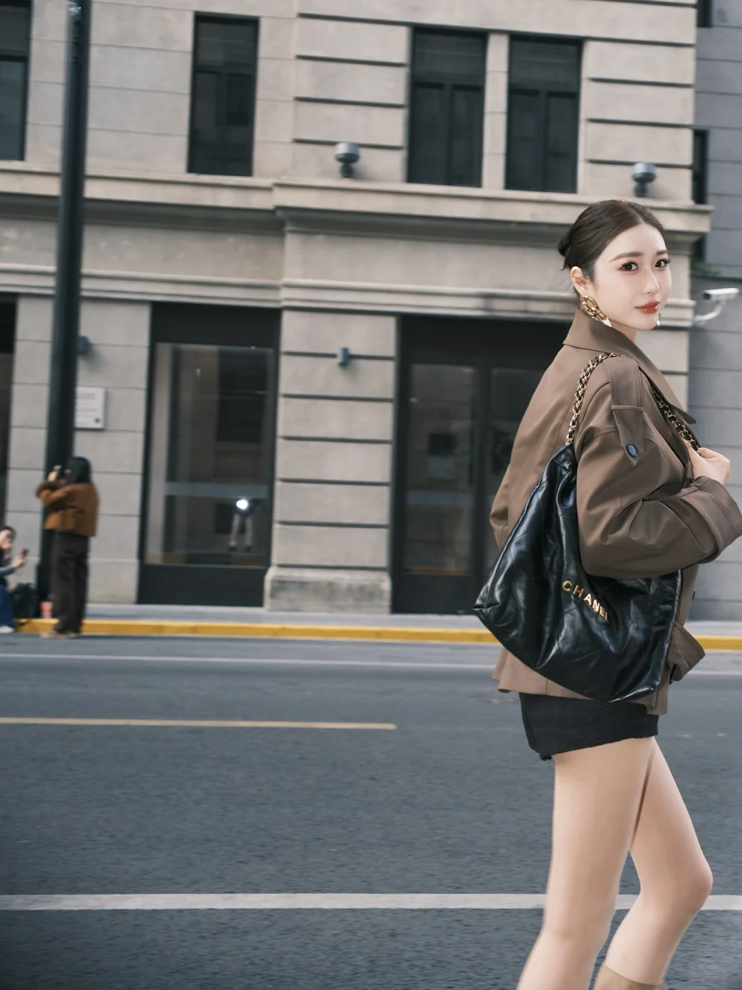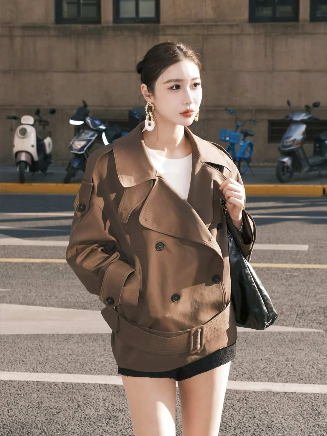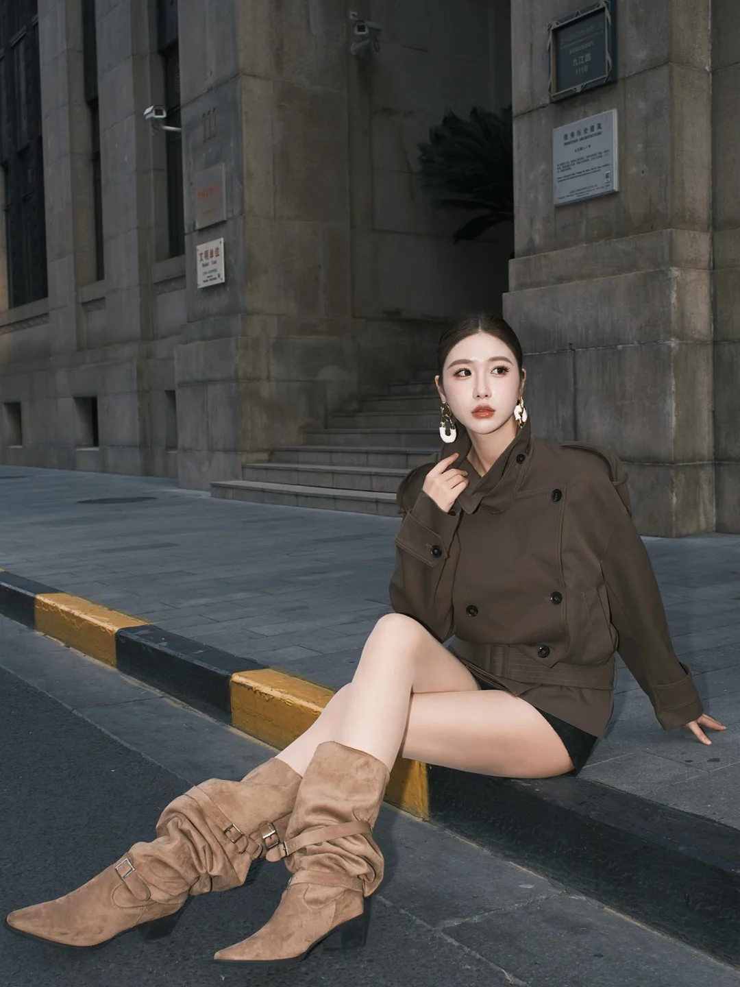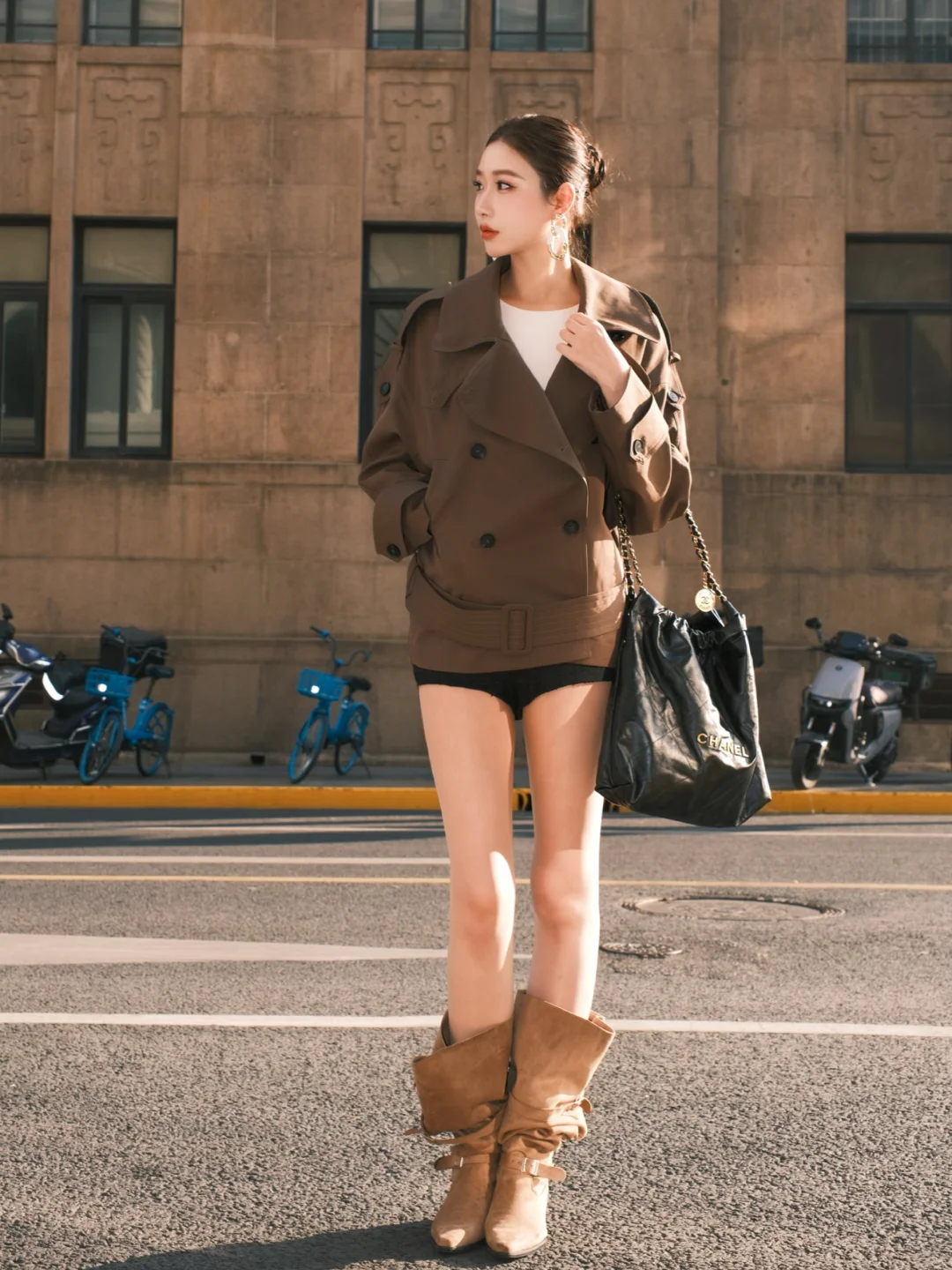 棕色大衣真是每年冬天都翻出来穿的经典款!最近喜欢用它搭过膝靴——卡其色短裤若隐若
