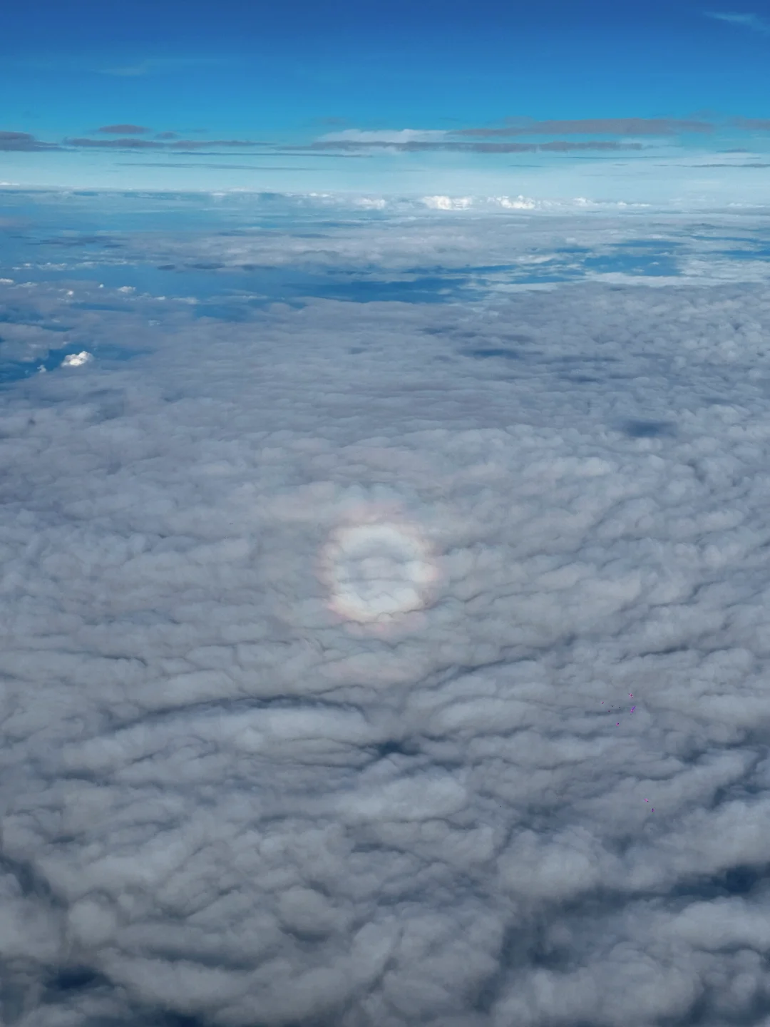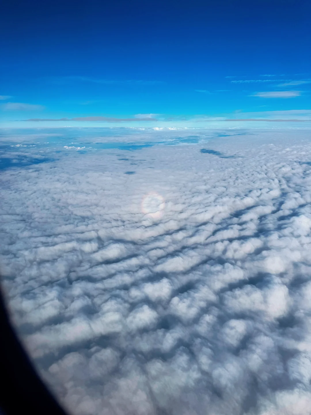 窗外的云层上出现了圆形的彩色光晕