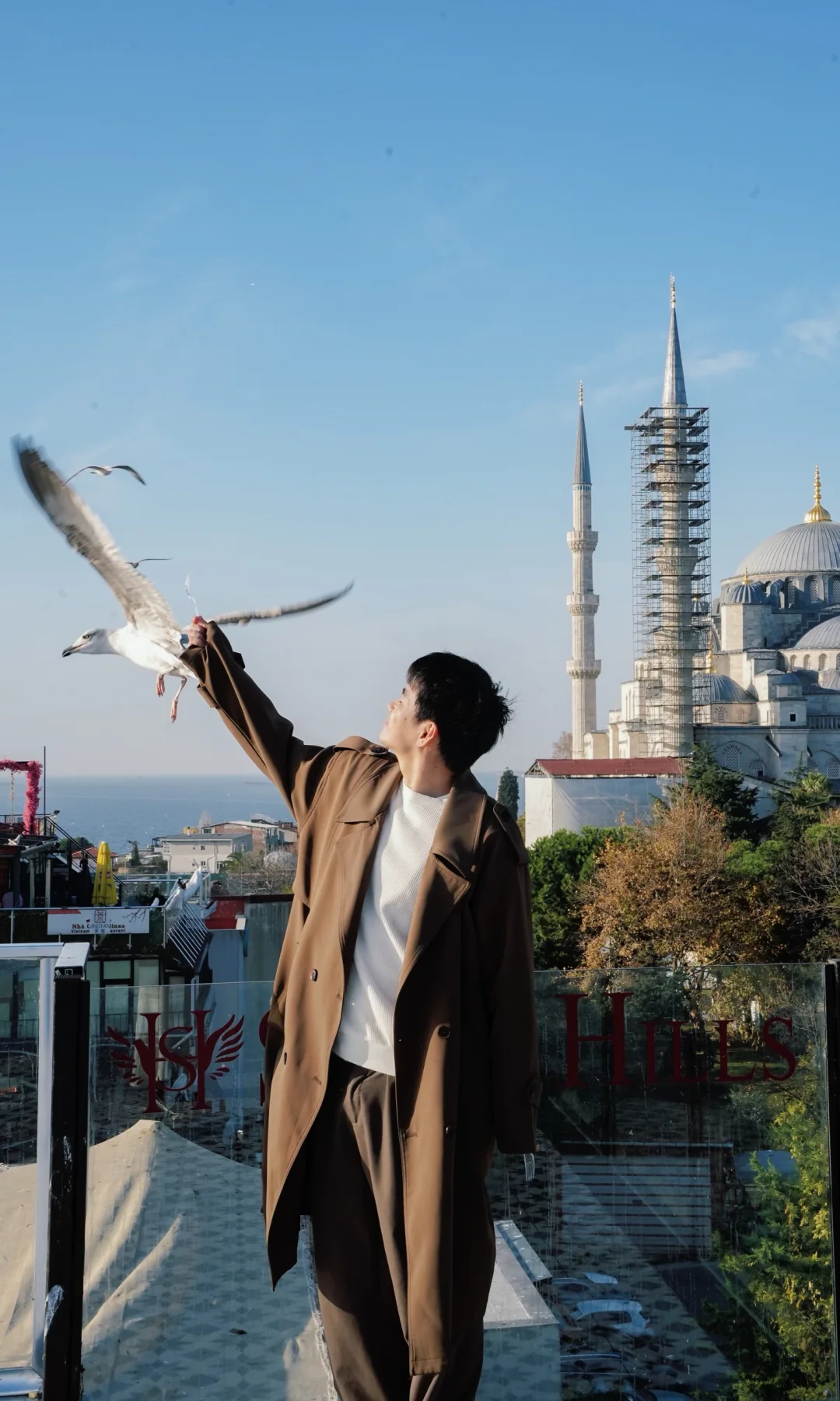 ✅清晨在蓝色清真寺旁的屋顶餐厅喂海鸥吃早餐