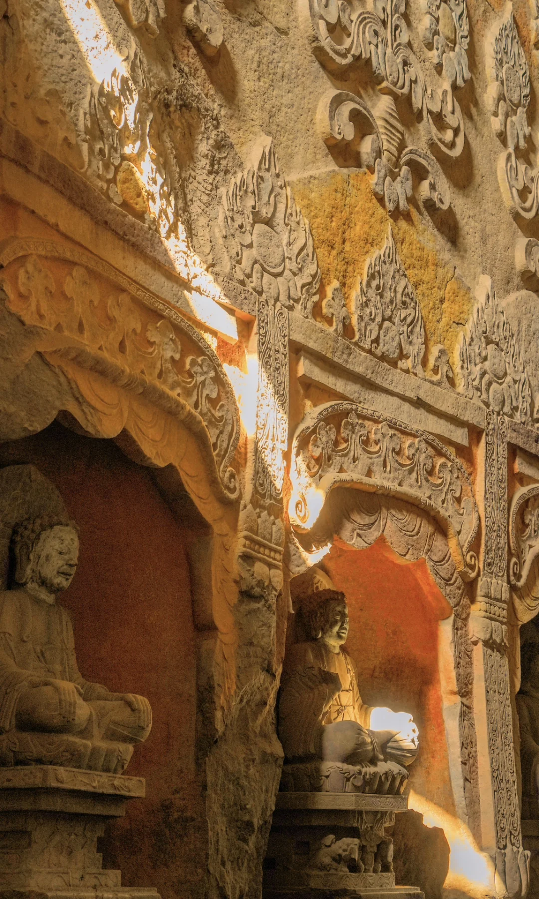 光线穿越洞壁如柱,洒入幽深的石窟佛像里