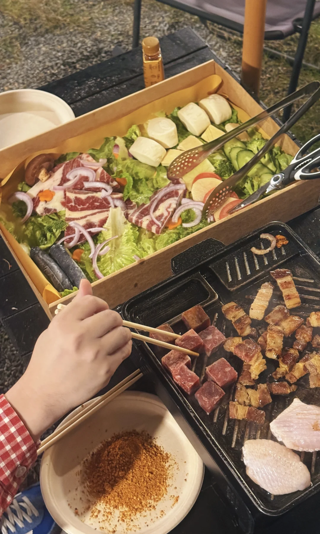 日落后一起在湖边吹着秋风烤肉聊天