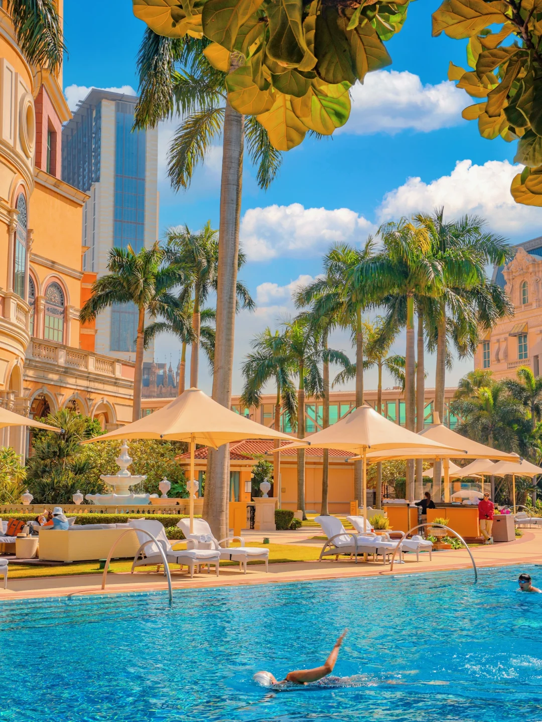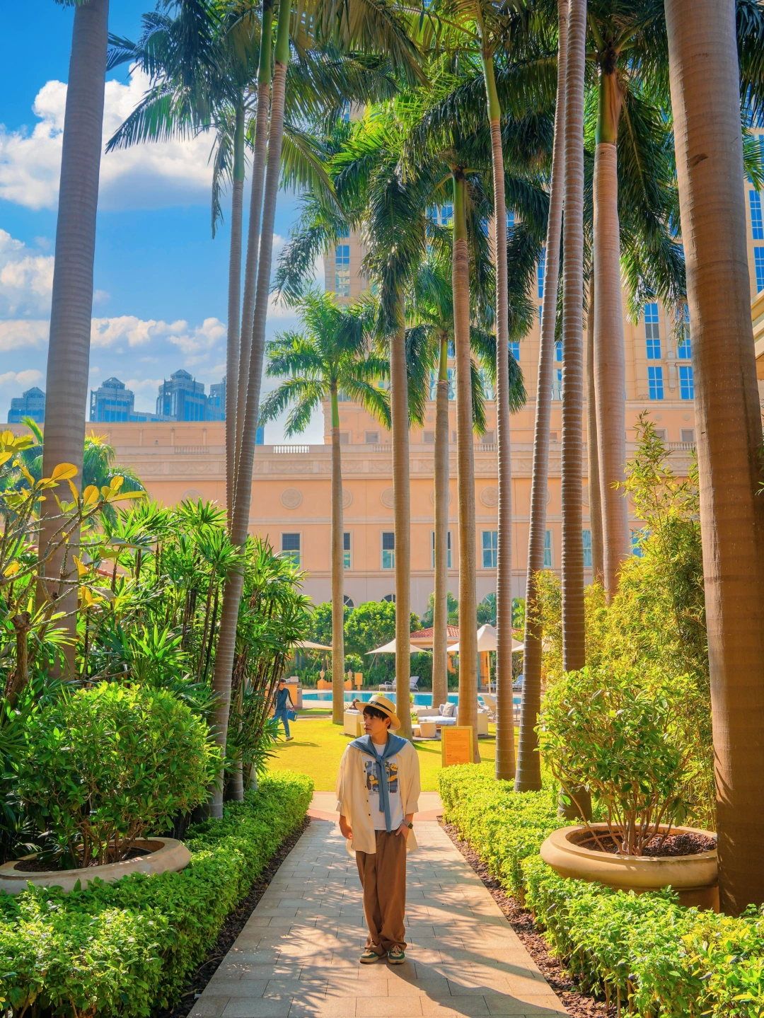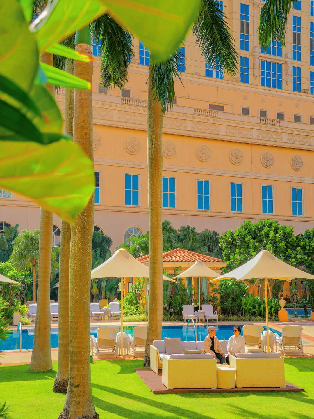 这里竟然有一片巨大的室外泳池,热带植物花园和草坪