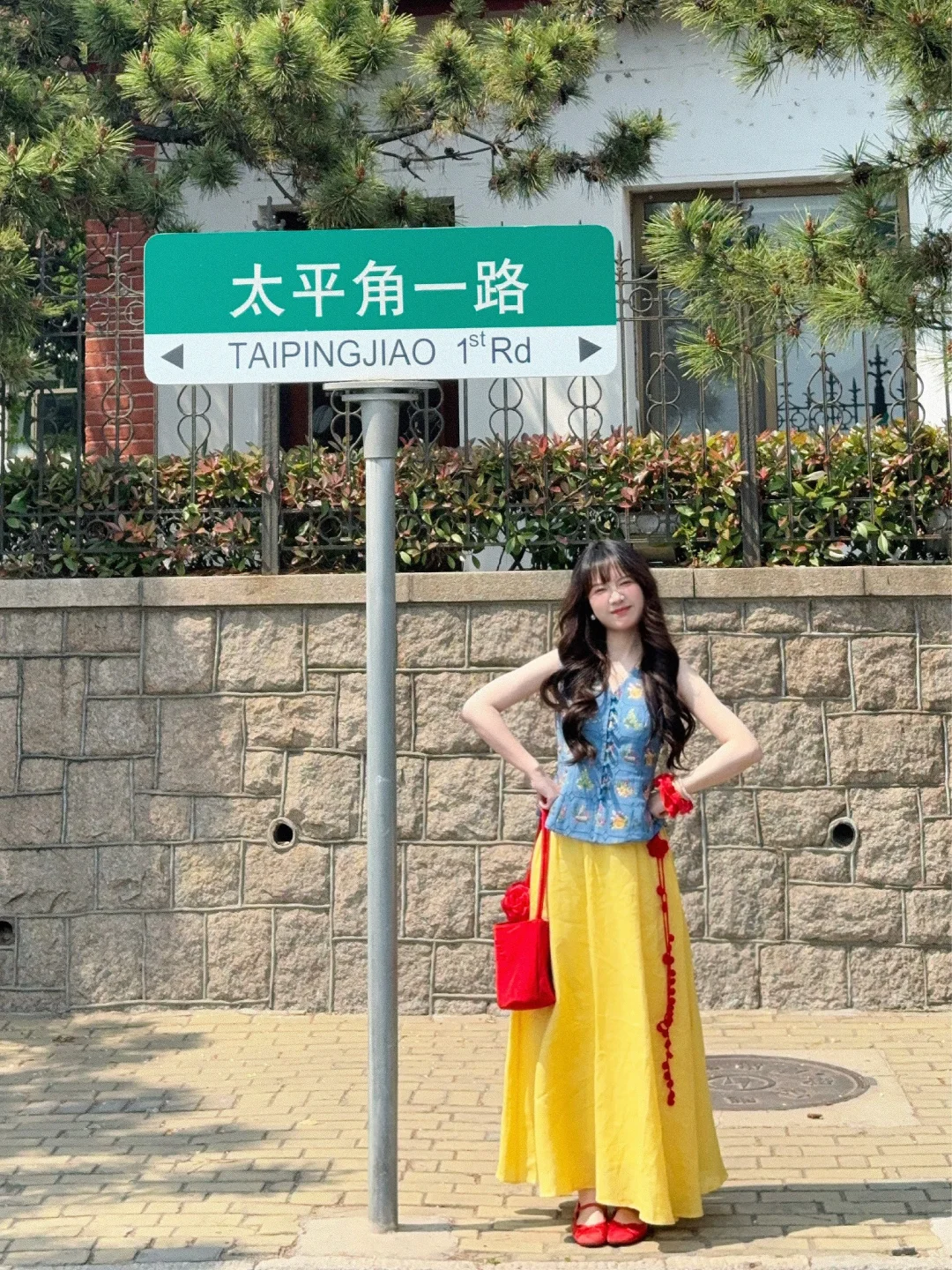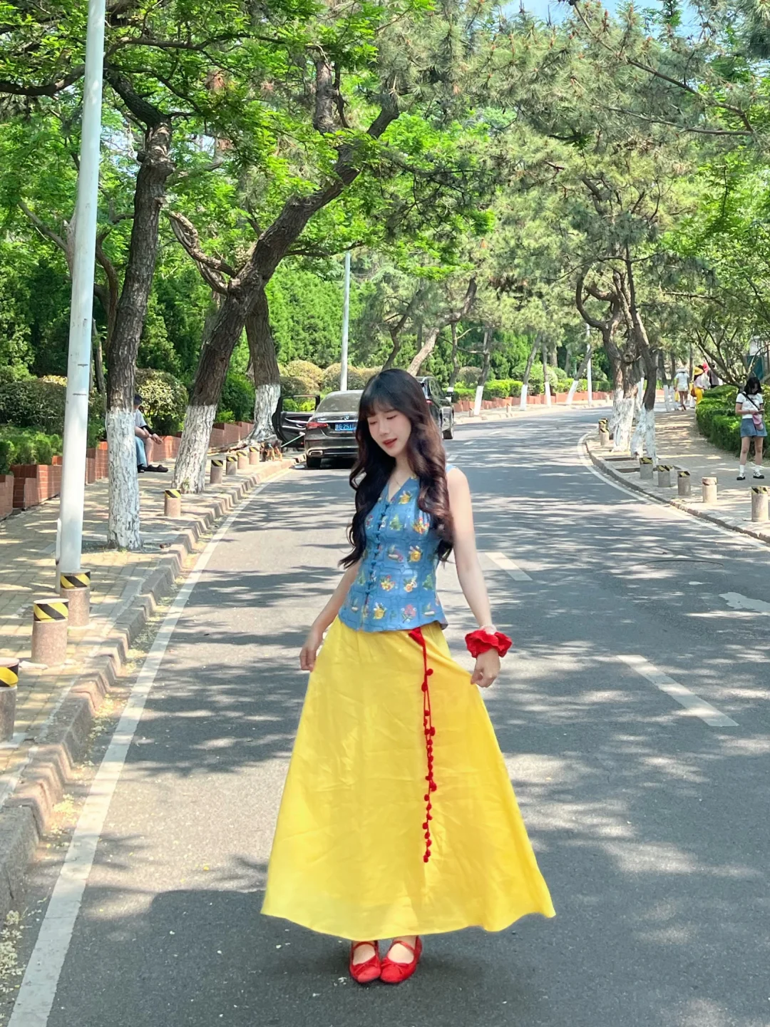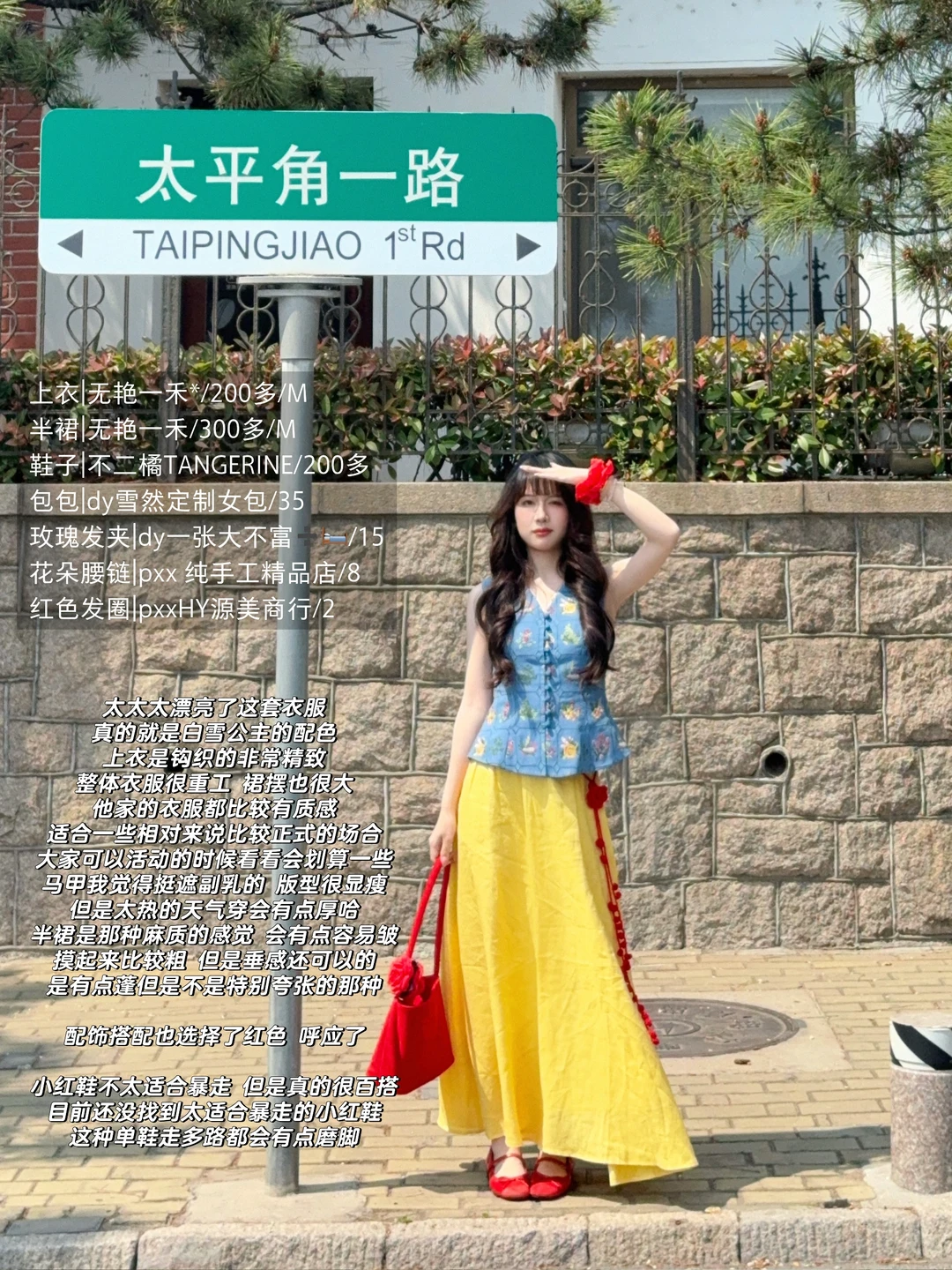 168/106左右 特别适合迪士尼的裙子!!! 完全就是白雪公主既视感 思路打开 大家穿蓝色上衣➕黄裙子➕红鞋➕红色发饰 其实也可以搭配出差不多的效果 这套衣服我感觉也很适合去南法度假 很优雅显瘦的一套 真的非常非常喜欢 官搭就很美丽 不太建议拆开来穿 如果非要分开搭配的话 裙子也可以搭配别的上衣 比如蓝色粉色白色的收腰衬衫 或者亚麻棉麻衬衫之类的 搭配一字肩或者斜肩上衣也不错 拍照地点:📍青岛八大关·太平角公园