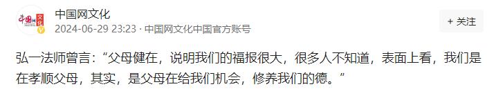 弘一法师曾言:“父母健在,说明我们的福报很大,很多人不知道,表面上看,我们是在孝顺父母,其实,是父母在给我们机会,修养我们的德。” 麻烦看官老爷们右上角点击一下“关注”!(信息来源:中国网文化) 在人生的长河中,每个人都是自己命运的舵手,而在这段航行中,最温暖的港湾莫过于家的怀抱,始终有两双始终默默注视和无条件支持我们的眼睛。 父母健在说明我们的福报很大,或许有些人会觉得是理所当然,毕竟在成长的路上,父母的陪伴似乎是天经地义无需多言。 细细品味之下,方能感受到其中蕴含的深意,在这个瞬息万变的世界里,能够拥有父母健康的陪伴,是多少人梦寐以求而不可得的幸福。 这份福报不仅仅是物质上的给予,更是心灵上的滋养,是生命旅途中最坚实的后盾,让我们在风雨飘摇时有所依归,在迷茫困惑时有所指引,是生命中不可或缺的光与热。 孝顺作为中华民族的传统美德,其本质远不止于表面上的侍奉与供养,更是一种心灵的沟通,是理解和尊重与爱的传递。 表面上看我们是在孝顺父母,实则是父母在给予我们一个无比宝贵的机会,让我们在日复一日的关怀与照顾中,修养自己的德行和完善自己的人格。 父母用无私的奉献铺就了我们前行的道路,在这个过程中父母或许不求回报,但他们的每一份付出,都值得我们用一生的时间去铭记与感激。 孝顺不仅仅是物质上的赡养,更是精神上的慰藉,我们或许会因为工作的压力和生活的琐事而忽略了与父母的交流。 正是这些看似微不足道的陪伴与倾听,才是父母内心深处最渴望的温暖,一个电话的问候,一次回家的探望都能让父母感受到无比的幸福与满足。 因此孝顺不应只是节日里的礼物,更应是日常生活中的点点滴滴,是那份无论何时何地都不变的牵挂与关怀,这些经历无形中锻炼了我们的意志品质,提升了我们的道德修养。 在父母的眼中,我们永远是需要呵护的孩子,而在我们心中,父母则是那座永远屹立不倒的山峰,而这份相互的依赖与支撑,构成了生命中最坚实的力量源泉。 通过孝顺父母,我们学会了如何去爱和如何去感恩,以及如何在人生的道路上不断前行,追求更高的境界与更深的智慧。 孝顺不仅是一种美德,更是一种修行,父母健在不仅是我们的福报,更是我们提升自我、完善人格的最佳时机。 在未来的日子里,让我们珍惜与父母相处的每一刻时光,用实际行动去践行孝顺之道,让爱与感恩成为我们生命中最美的风景线。 也让我们在孝顺的过程中不断修养自己的德行,成为更加优秀和有爱的人,因为只有这样,我们才能不负父母的养育之恩,不负自己的人生使命。
