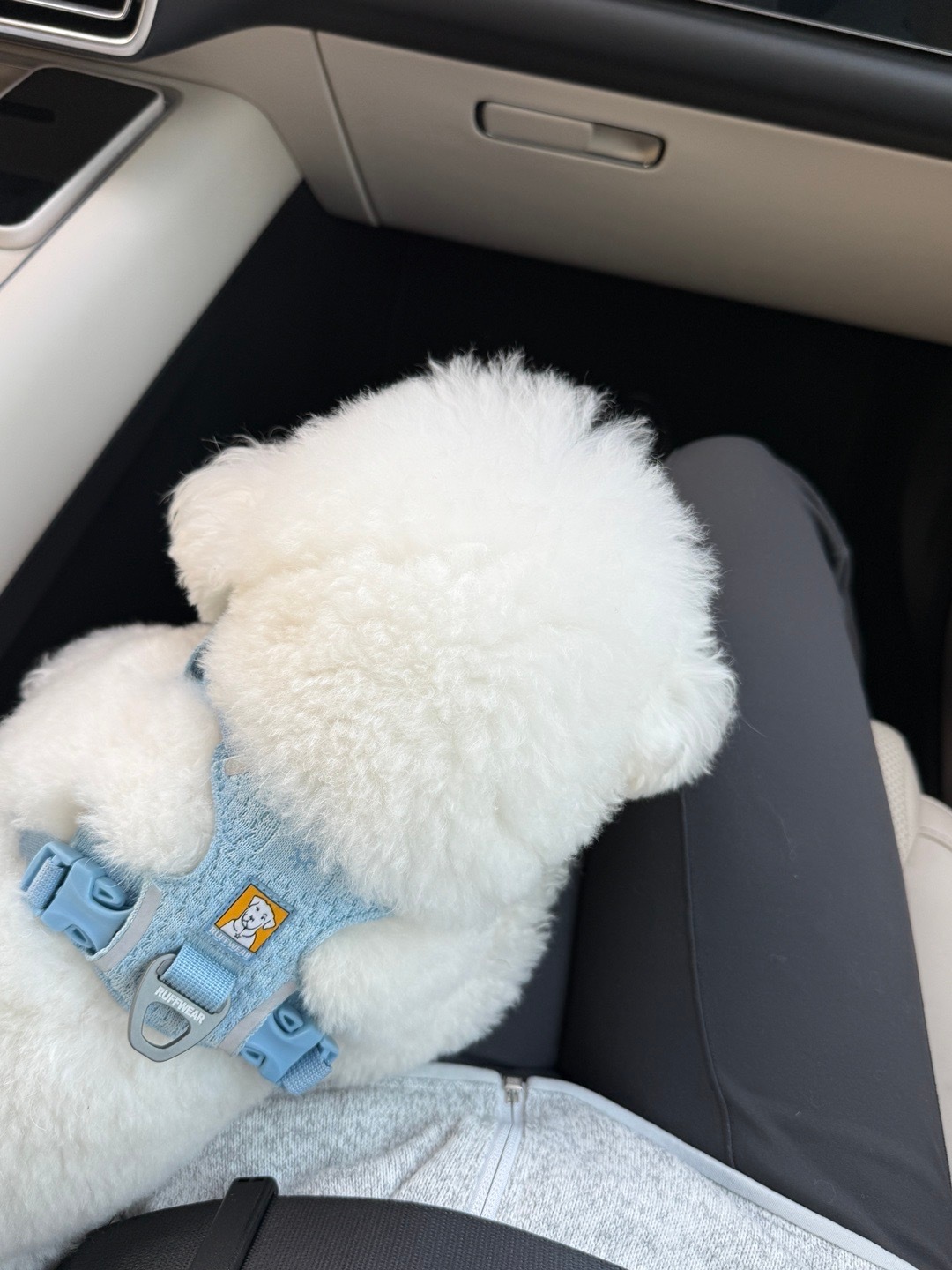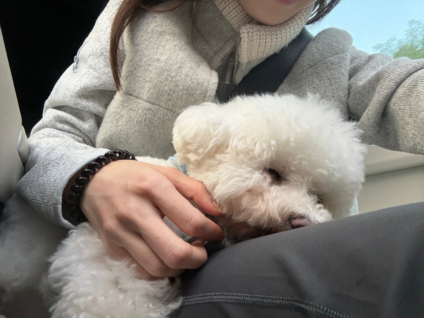 带kuku徒步一下午 小狗很兴奋 甚至有点儿体力消耗不尽的感觉 意犹未尽结果一到车上就趴在我腿上呼呼大睡 一只手撑着 一只手搭在我腿上 (它喜欢这个坐姿)直到困倦得撑不住了 脑袋才耷拉下去 湿漉漉的鼻子不断呼出热气 平缓均匀 裤子上也留下水蒸气来过的痕迹 嗯 幸福化成了冬天的一团小小的印迹