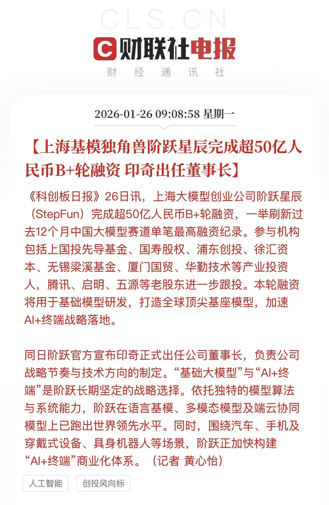 今早看到新闻,阶跃最新斩获了超50亿人民币B+轮融资,刷新大模型赛道过去12个月单笔融资记录,且超过智谱、MiniMax的IPO 募资金额!看了一下,这里面既有上国投、浦东创投等产业投资人,也有腾讯、启明等老股东跟投,阵容真的有点强。