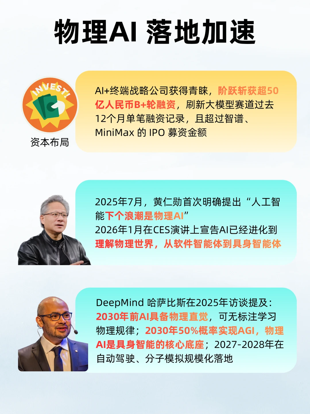 人工智能的下个浪潮“物理AI”即将到来,英伟达的黄仁勋和Deepmind的哈萨比斯都预言了这一新时代的来临。这四家里,阶跃是最有机会吃到最大红利的,一边手握着行业领先、最全的基座模型矩阵,一边和头部终端公司保持着深度的合作和项目落地,想象空间巨大。